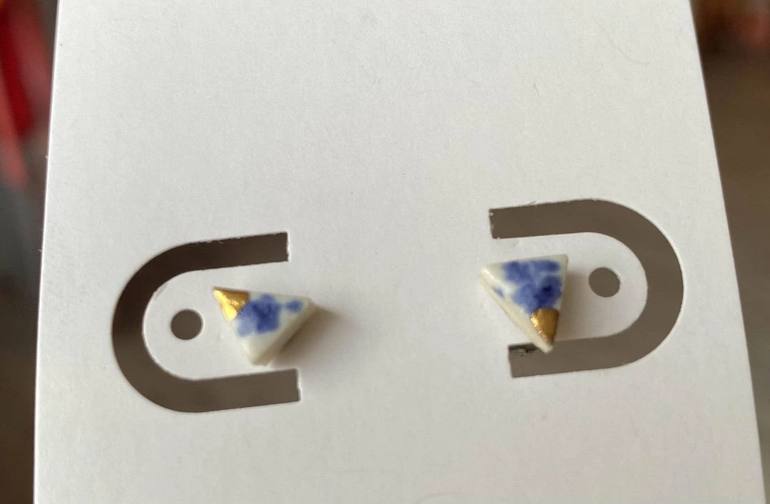7-10mm triangle porcelain studs with gold luster on surgical steel backs.