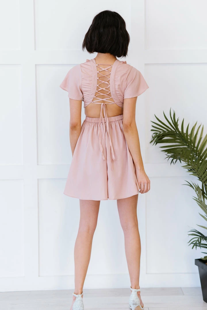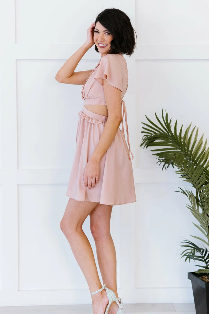 This alluring romantic dress features a deep V-neckline, cutout sides, ruffles, and a lace-up open back. Wear this to any upcoming event, and listen as the compliments flow in.