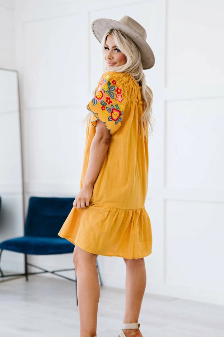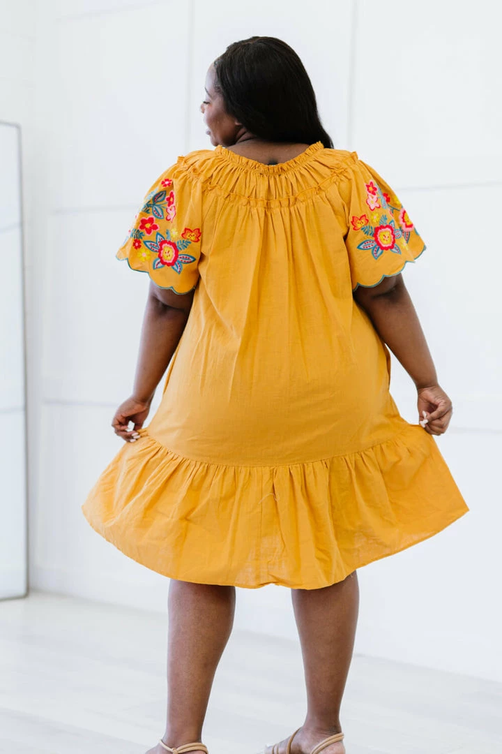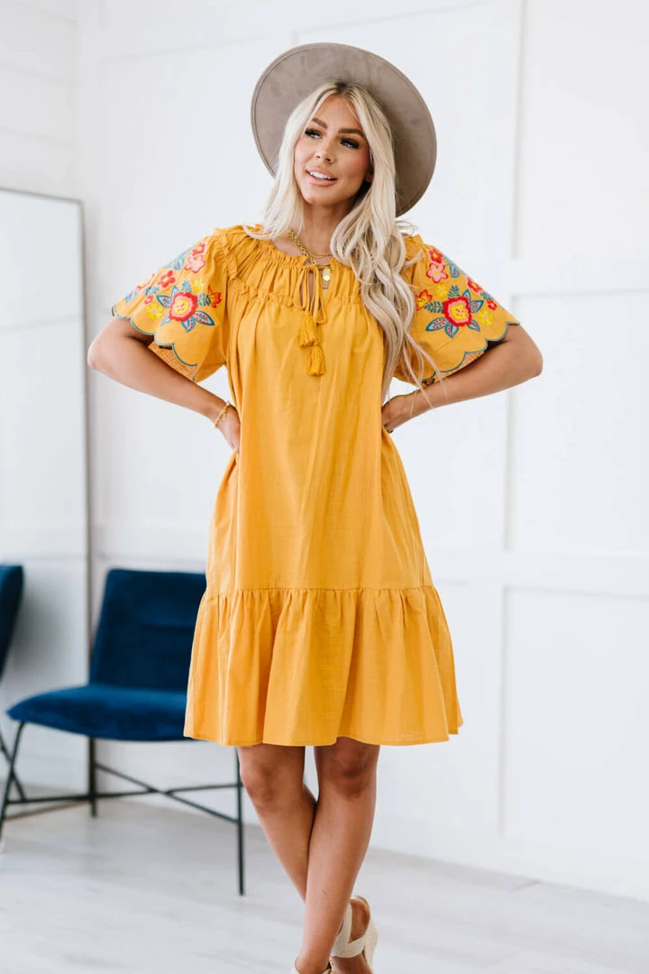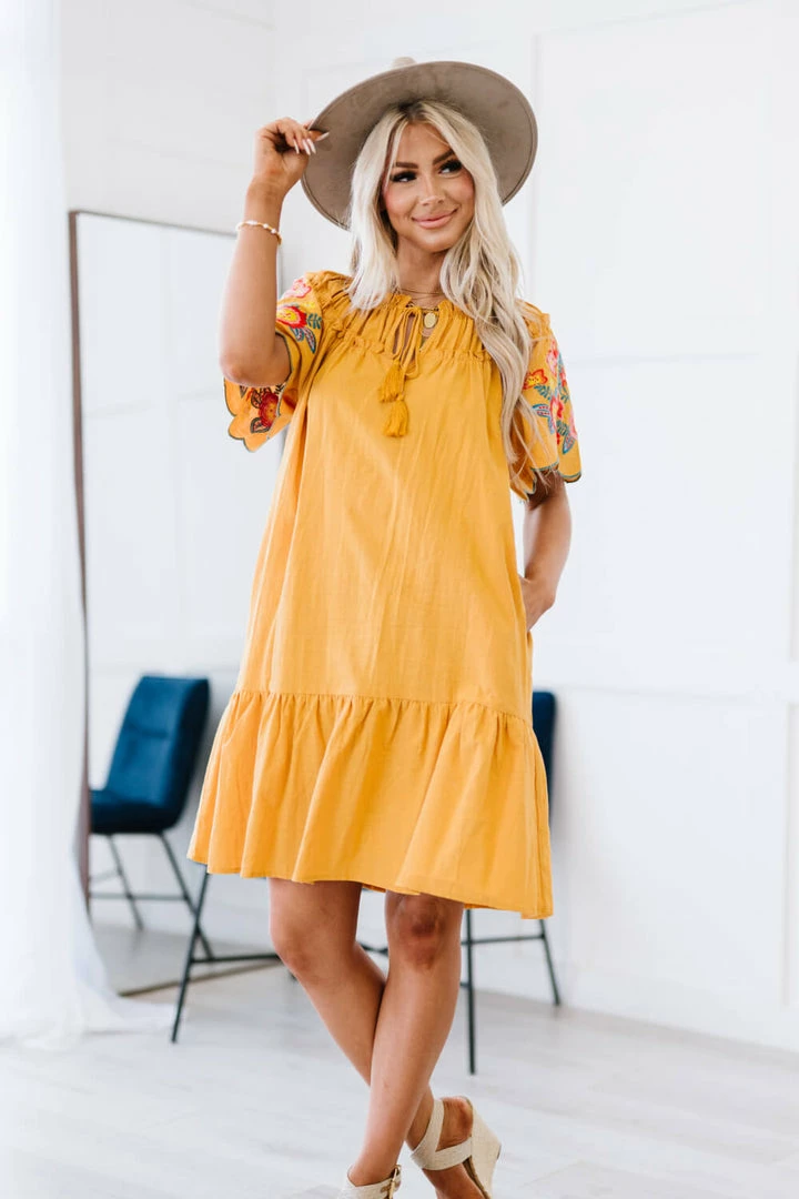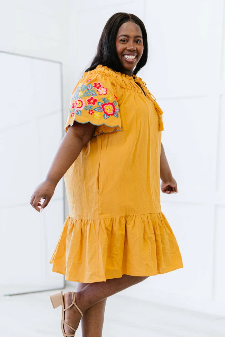 Whatever the occasion, this dress will own up to it. With carefully placed vibrant floral embroidery, a ruffle hem, and tassel ties at the neck, this exquisite dress is all things saucy and sunny.