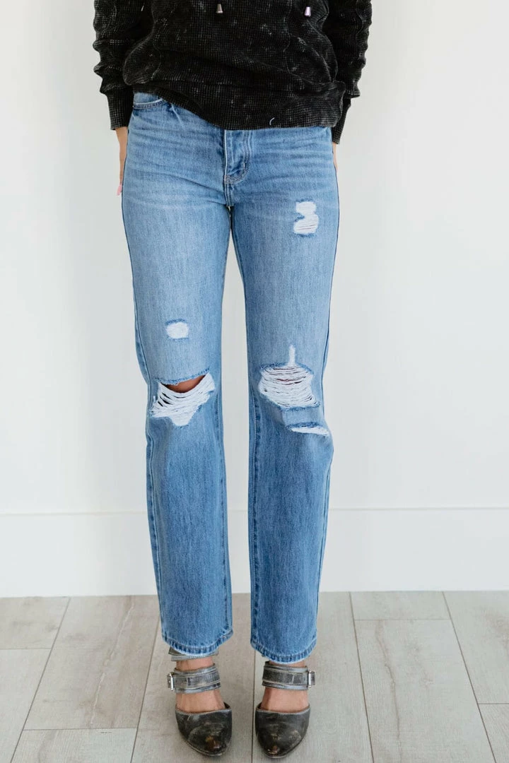 Be a knockout in our Now You’re Talking Distressed Straight Leg Jeans. Their structured, fashion-forward silhouette flatters every form and their hidden button fly is a fun detail!