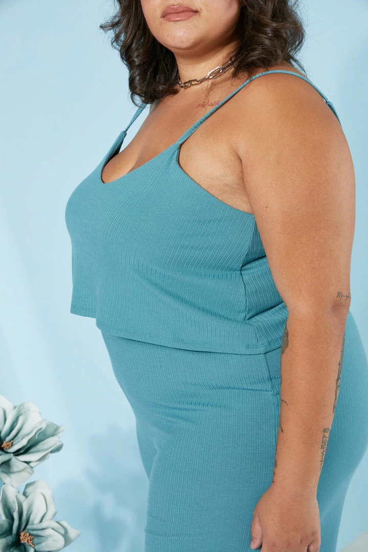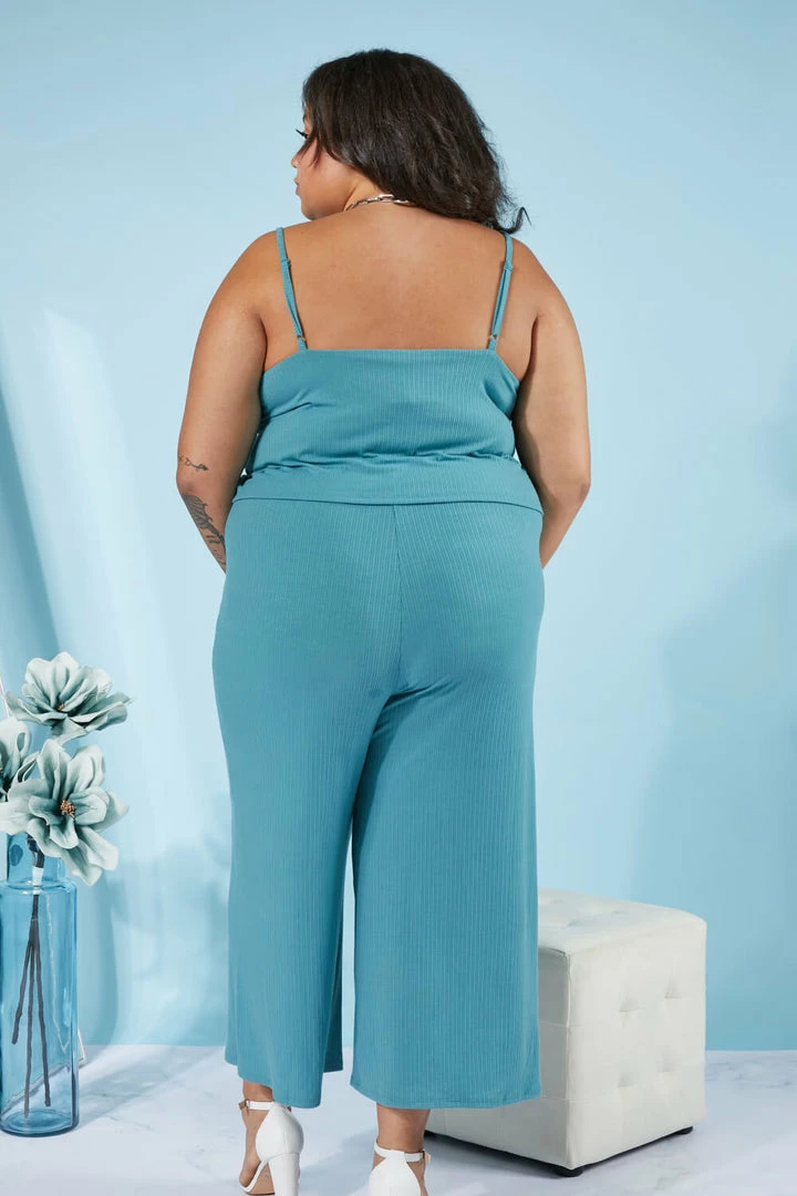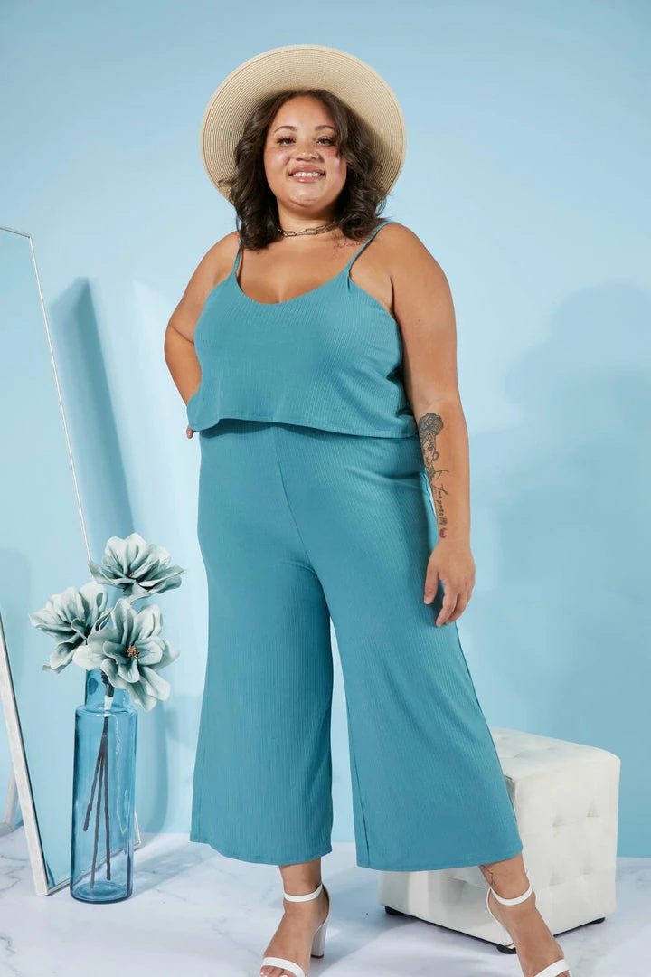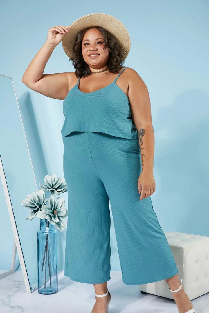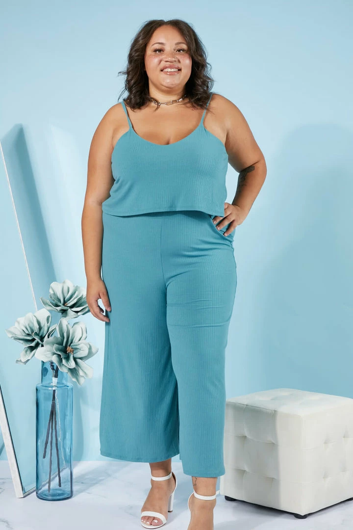 This ribbed jumpsuit has comfort written all over it. It includes adjustable spaghetti straps, a layered top, an elastic waistband, and cropped wide legs.