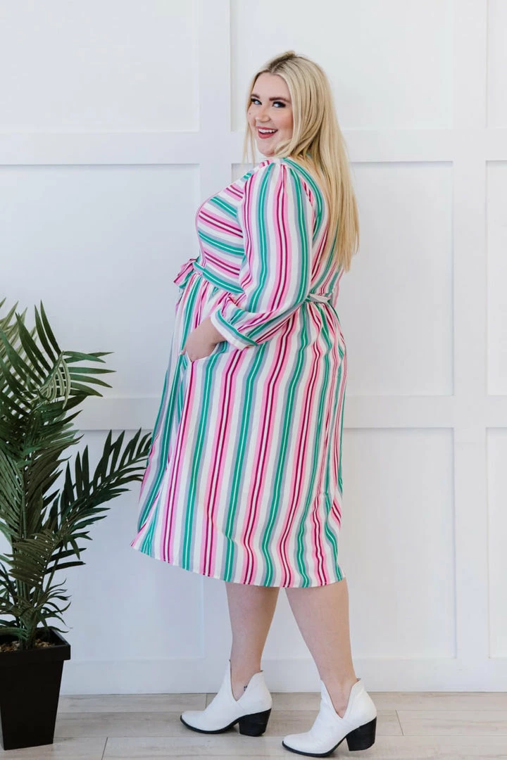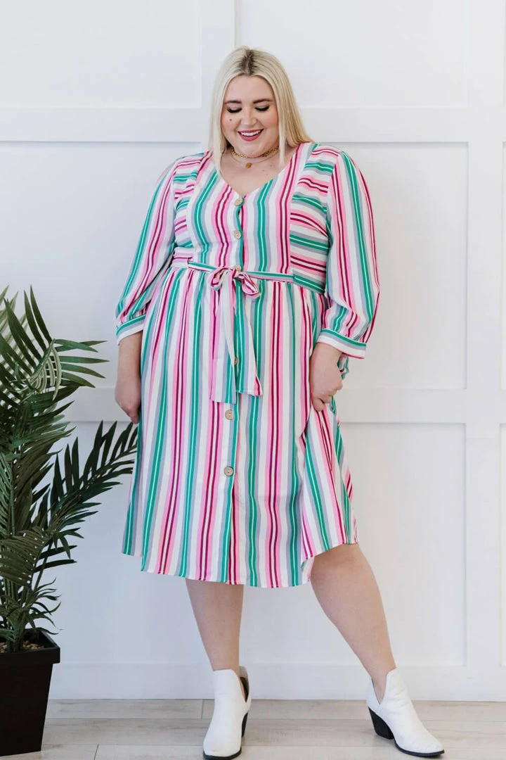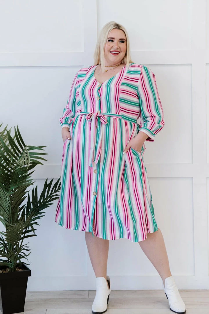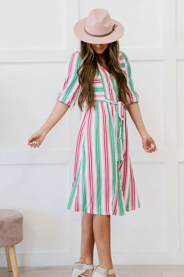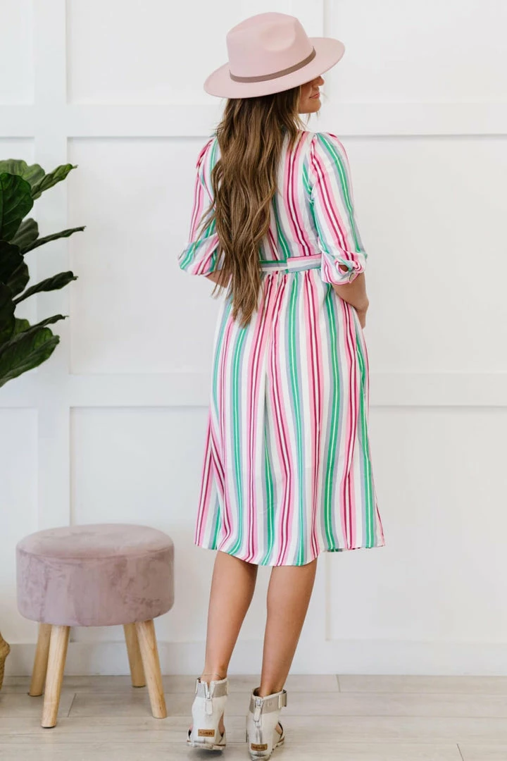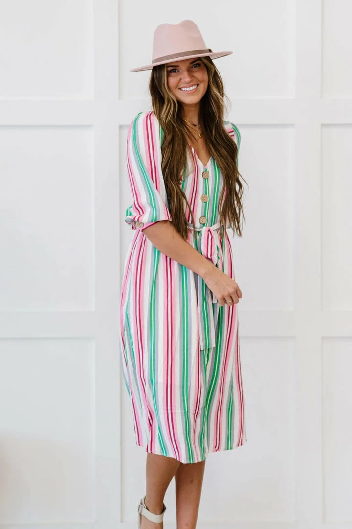 The colors on this dress will make you crave your favorite childhood sweet–for real. Featuring directional stripes, three-quarter sleeves, functional buttons, and a sewn-in lining, you really can’t go wrong. Tie the matching ribbon around your waist for an extra flattering and girly touch, and add some flats, sandals, or heels, depending on your preference!