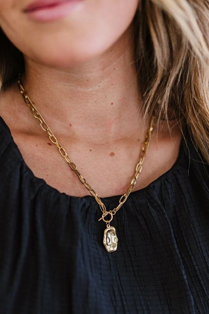 This fresh new double-layered necklace has a hammered pendant and a toggle clasp in front. Wear it to finish off all of your favorite looks!