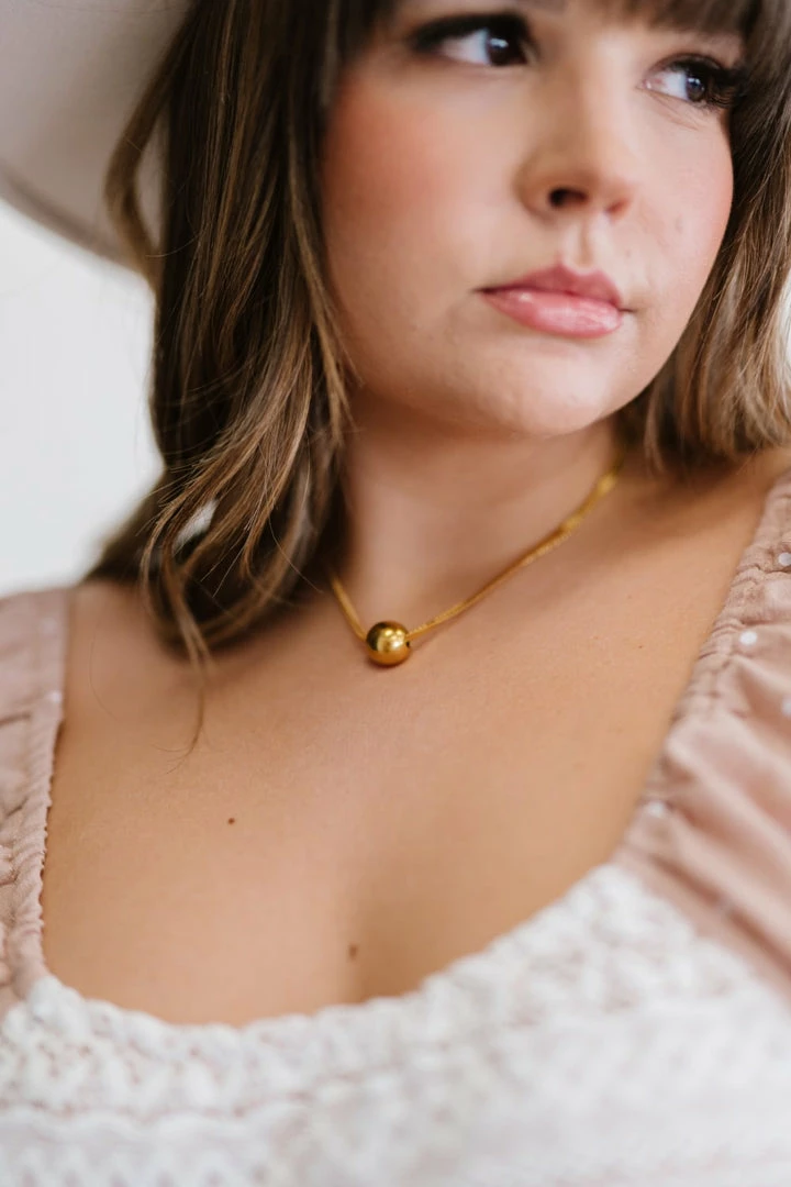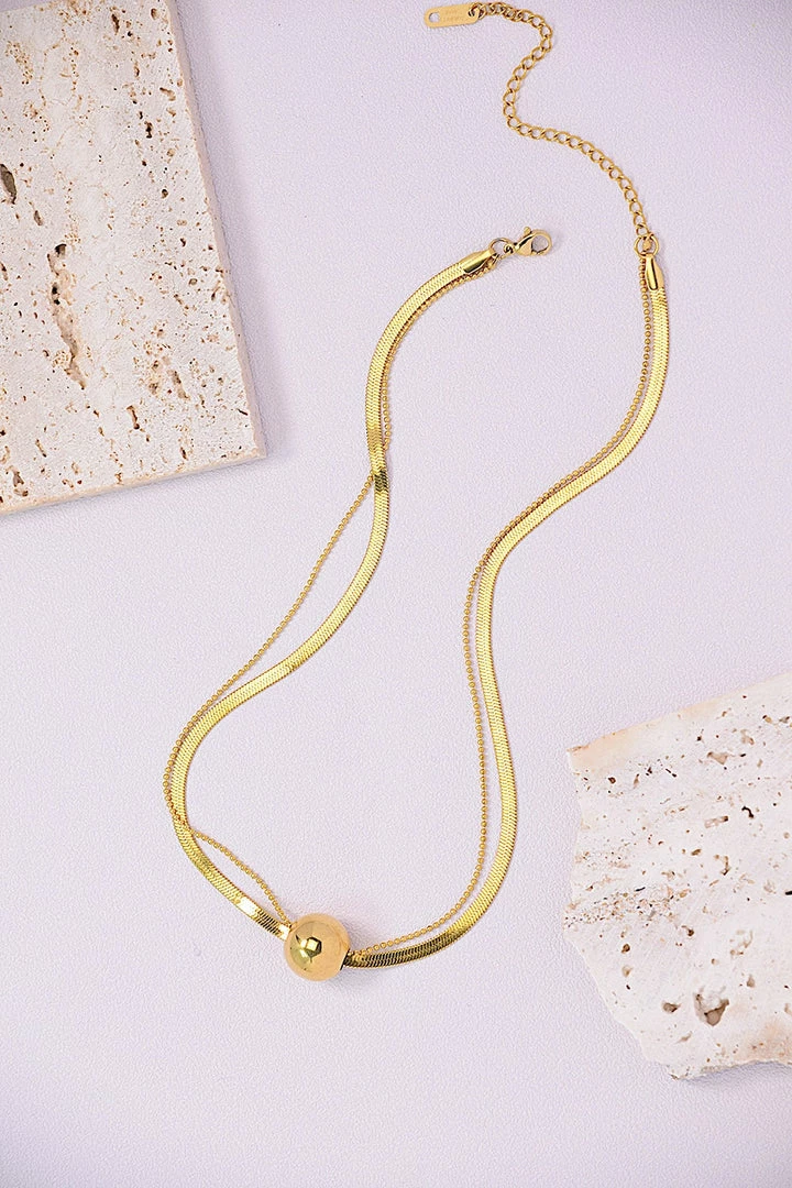 With a simple, gold, round bead on the end of this double-layered necklace, you can’t go wrong. Both chains are fed through the bead for a unique look.