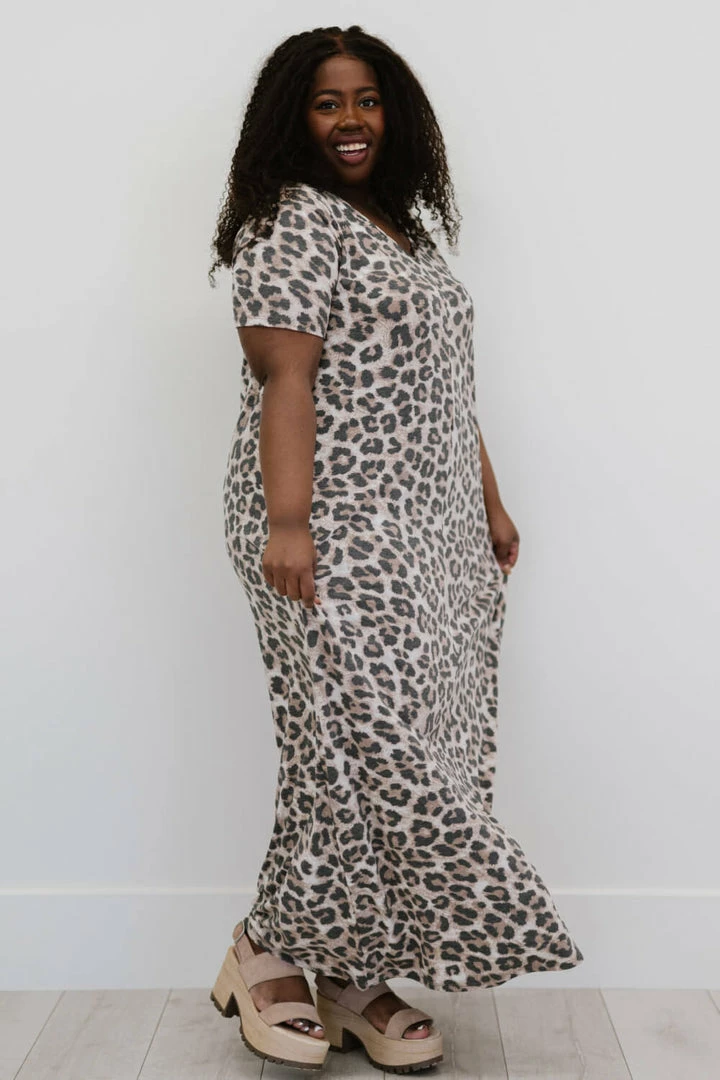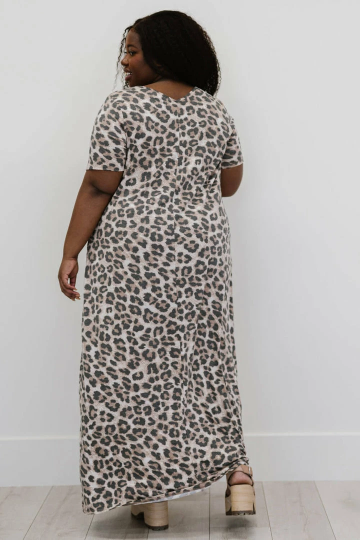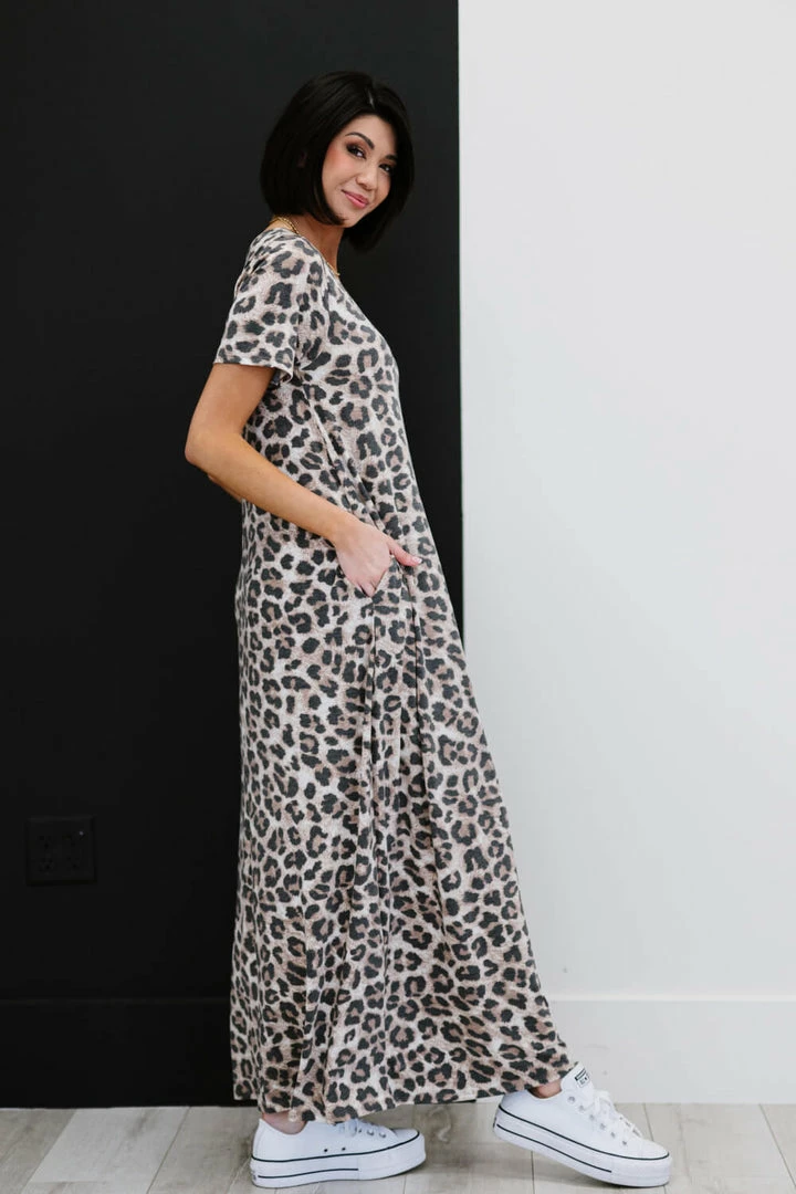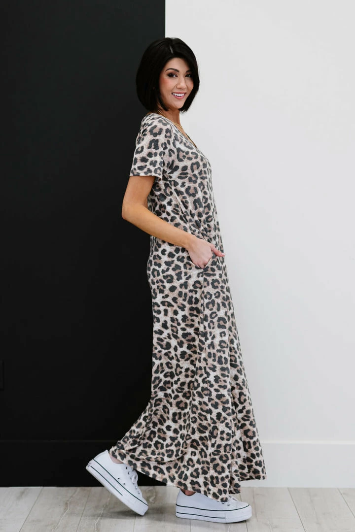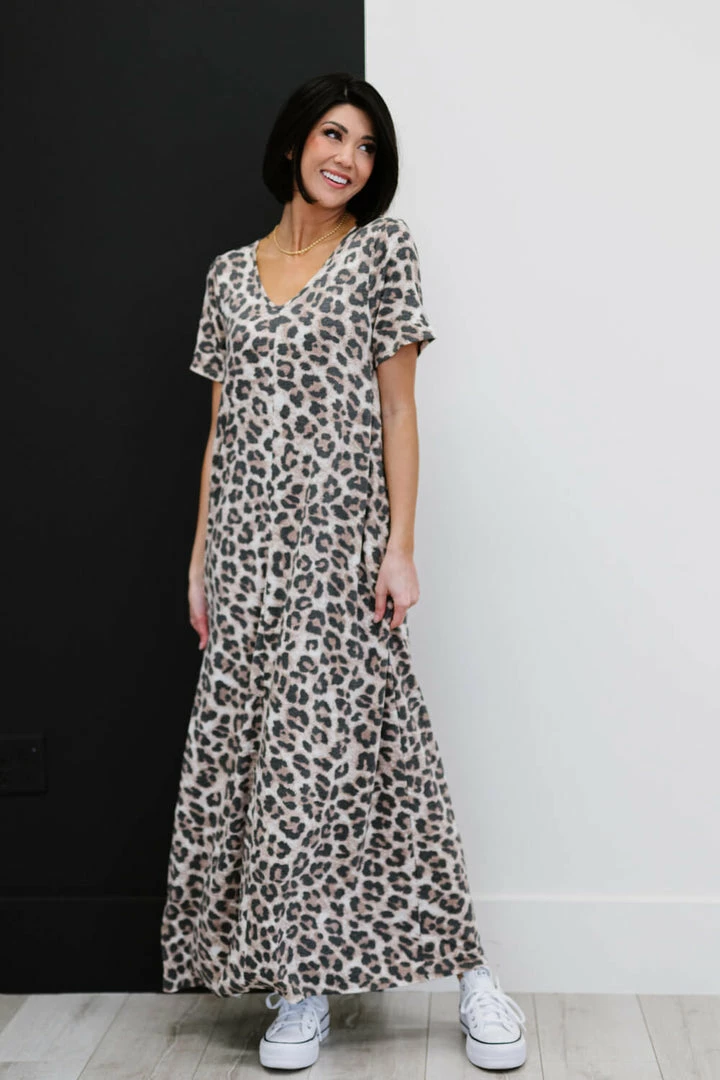 Bring out your wild side with this modern and casual leopard print maxi dress! The flattering v-neck and v-back design add shape to the ultra-flowy silhouette. The dress features pockets and touchable soft and stretchy fabric.