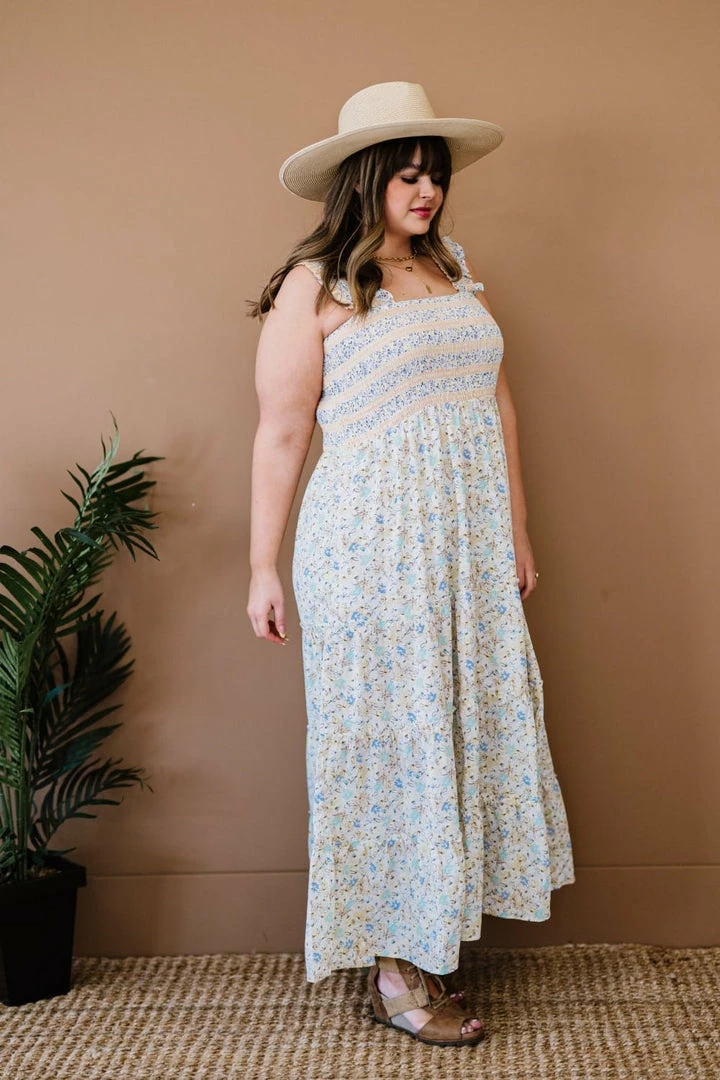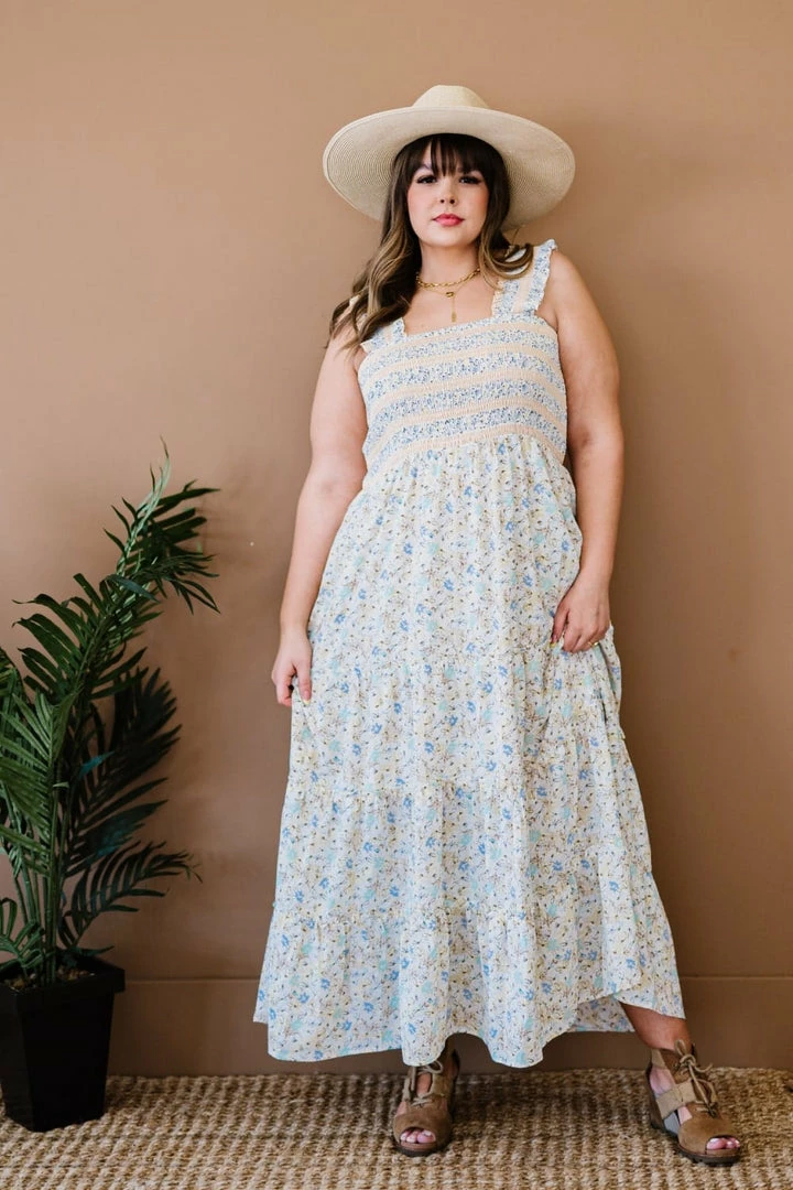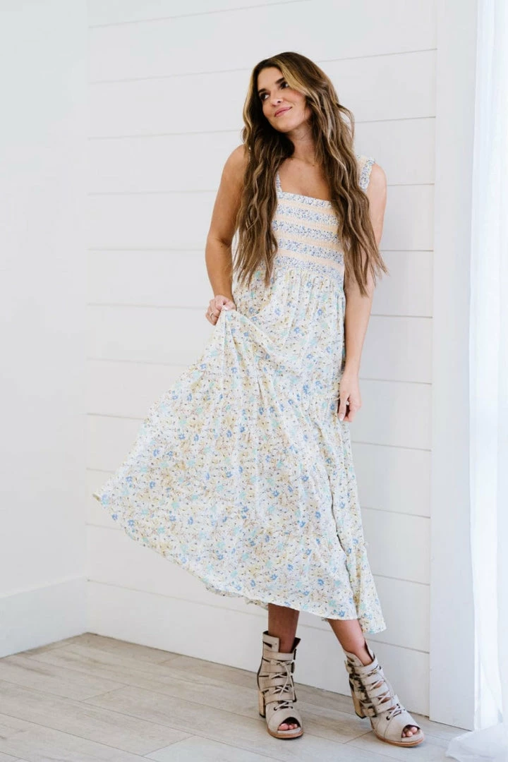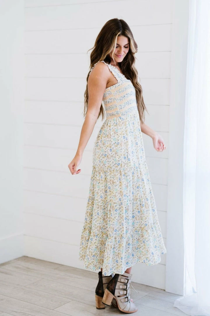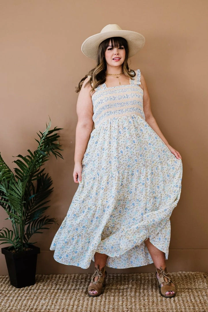 Add to your collection of floral prints with this subtle and understated floral dress. The frills on the straps add an extra-feminine touch to this tea-party-perfect midi. The stretchy smocking on the bust flatters bodies of all types, and the square neckline allows for layered jewelry.