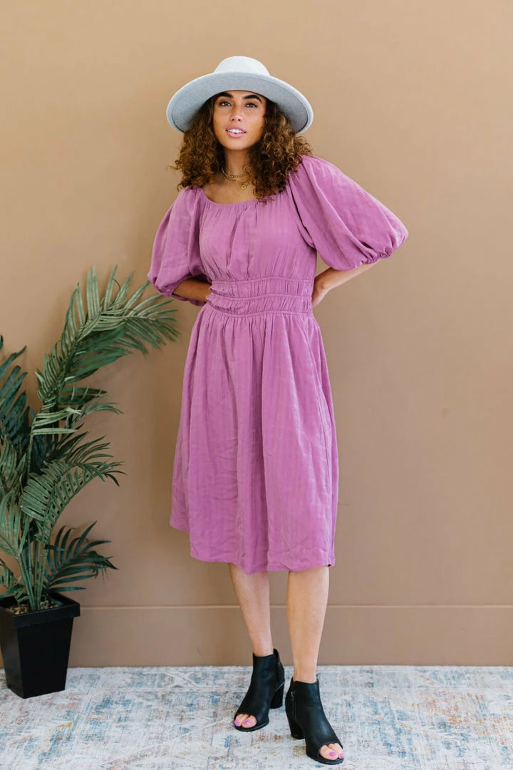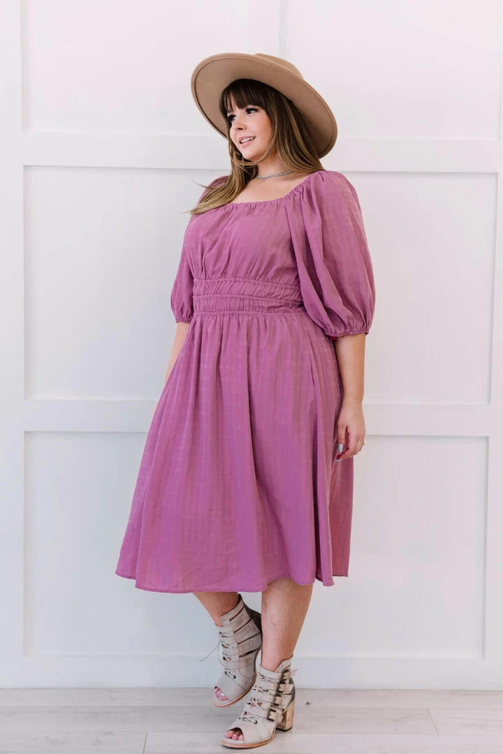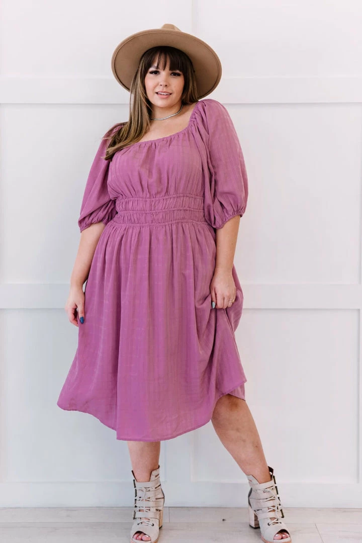 This cute-as-can-be dress features a subtle plaid print, half-length puff sleeves, a square neck, and a smocked waist. It also has elasticized sleeves and neckline.