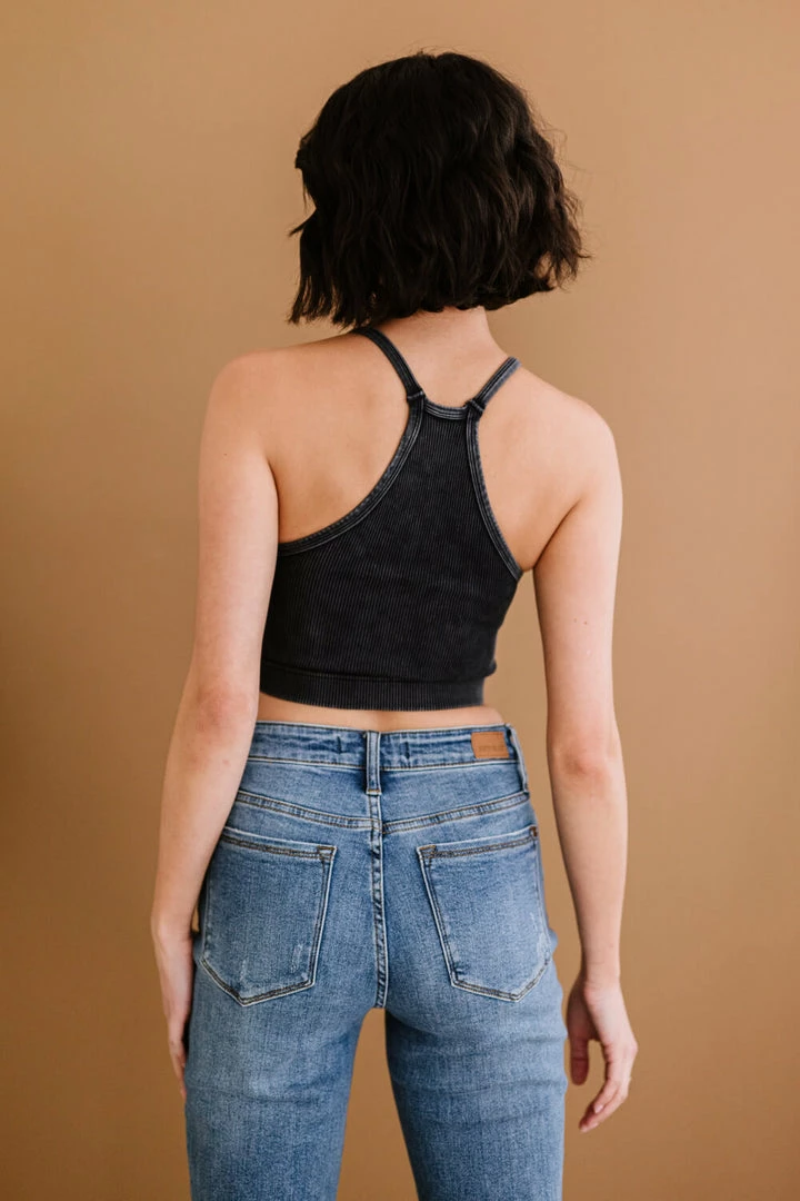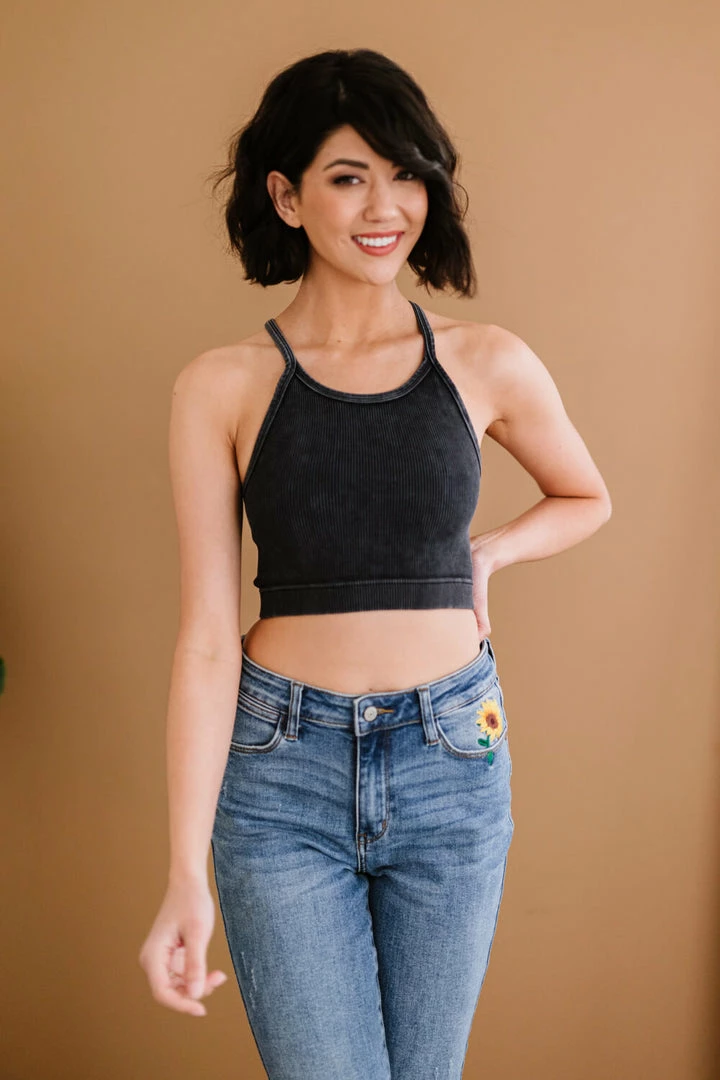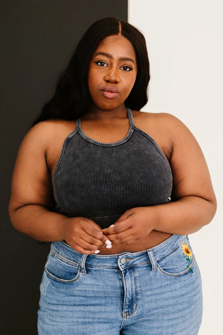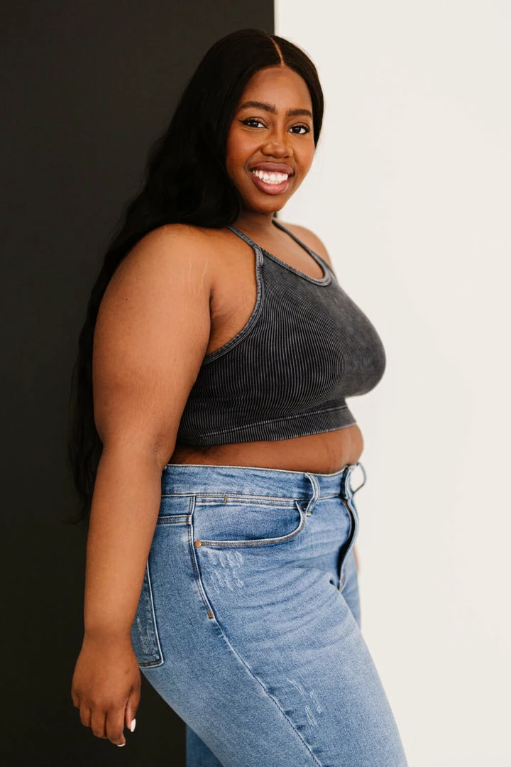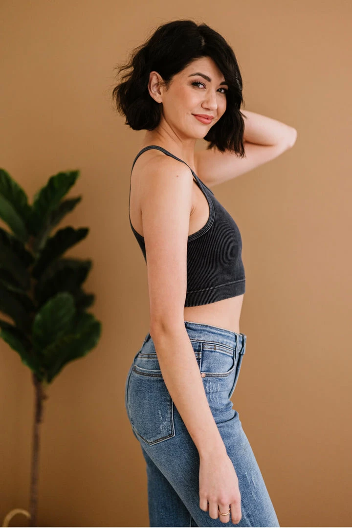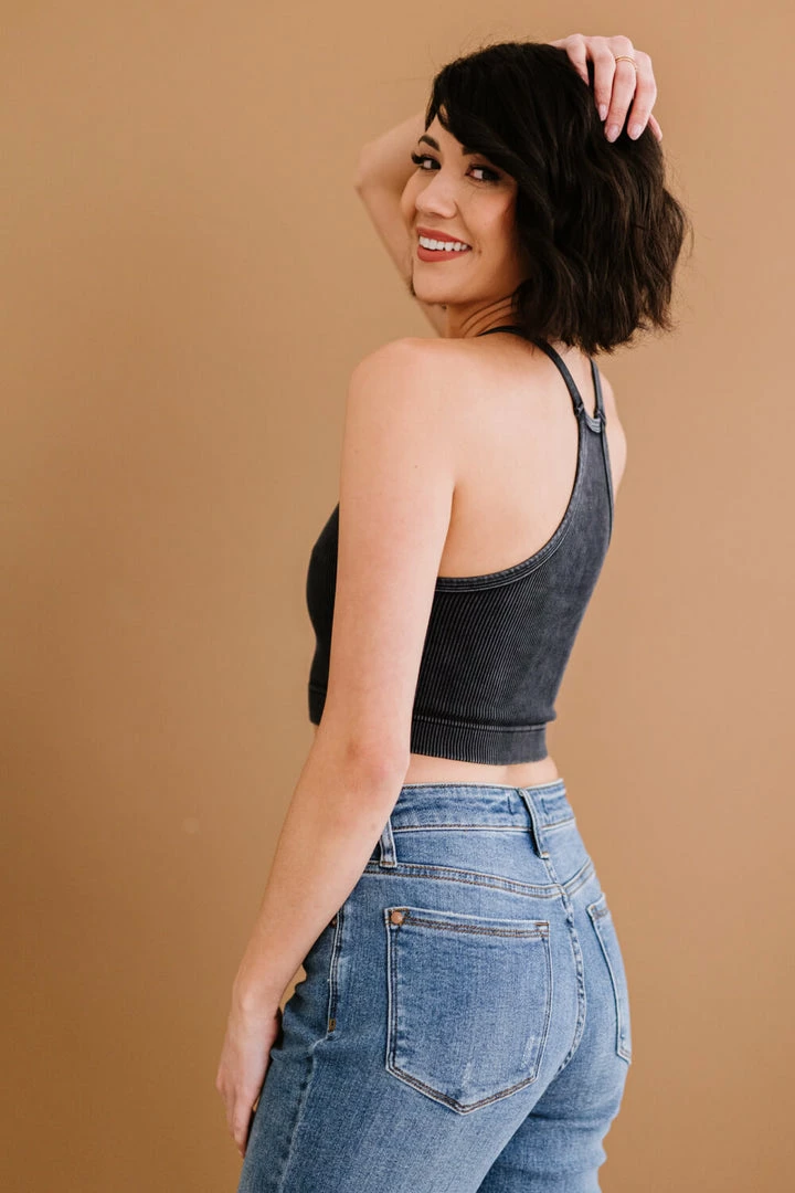 This cropped cami will really up your layering game. It comes in a subtle mineral wash on a ribbed, stretchy fabric. Wear under a shacket, a sheer top, or style it alone.