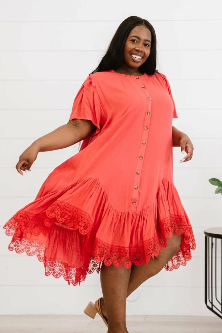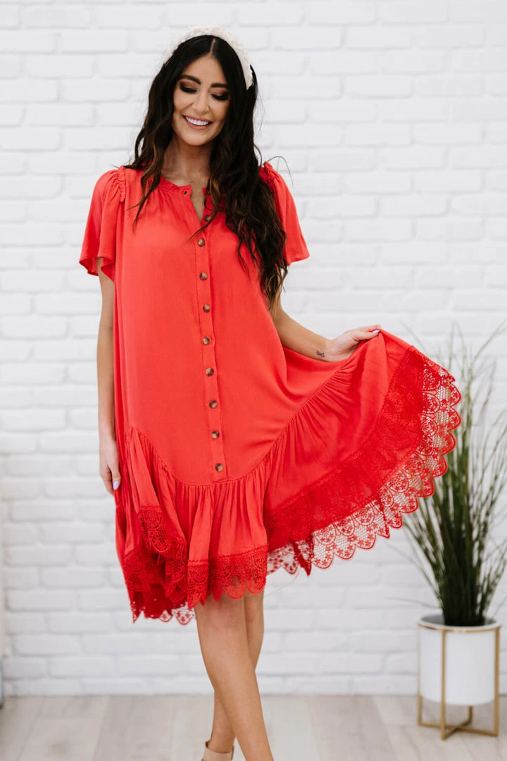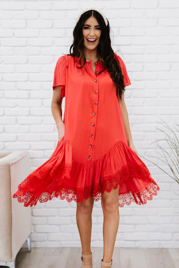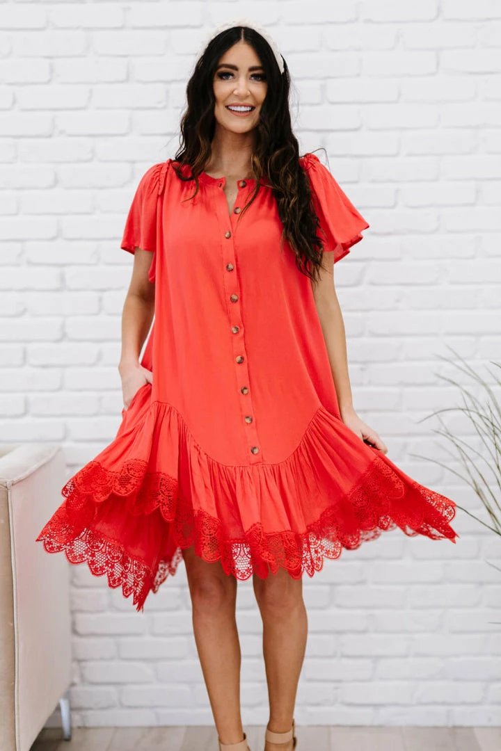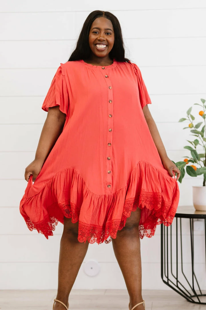 The design of this dress uses a flowy drape and a delicate crochet lace trim to make you feel like you’re flying through the clouds. Other noteworthy details include a unique asymmetrical ruffle hem, pleats, and buttons down the front.