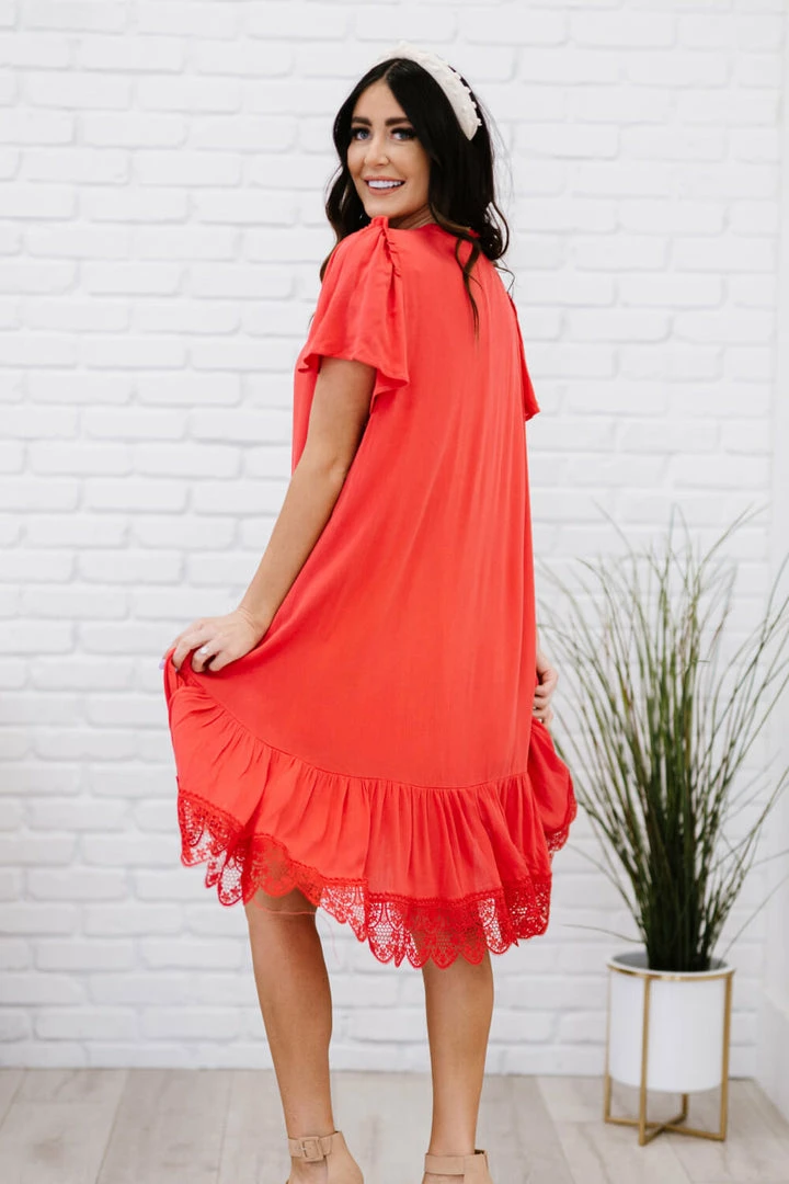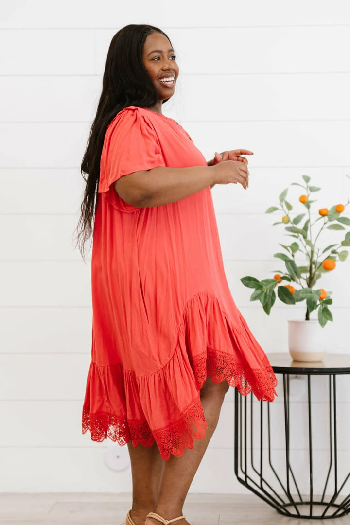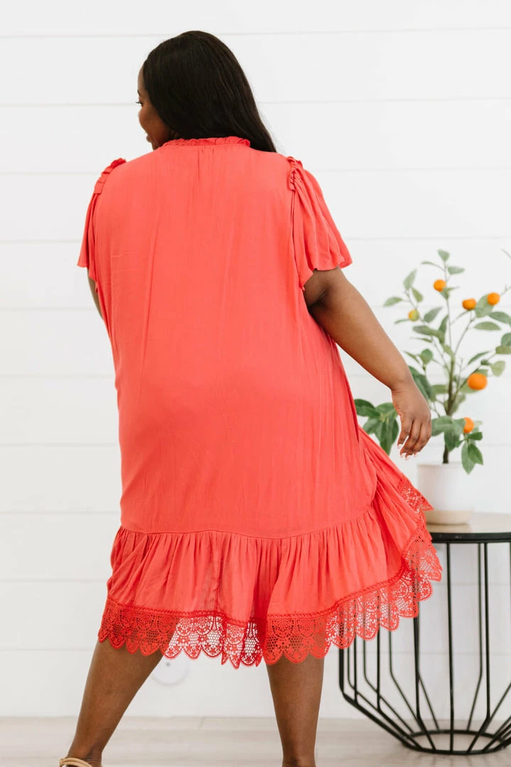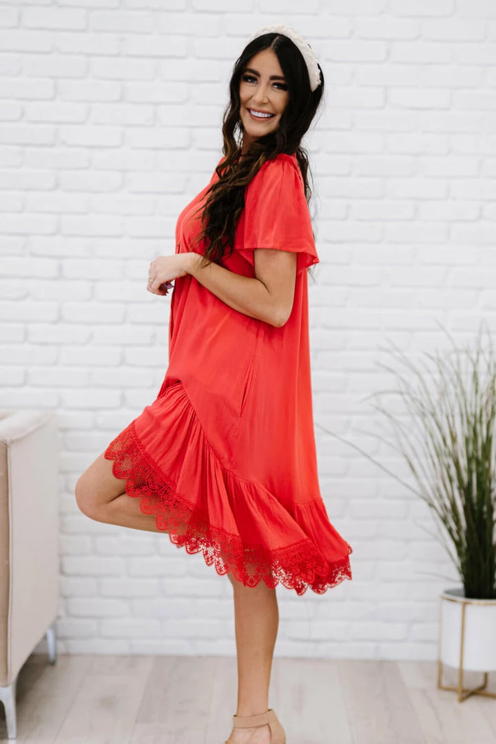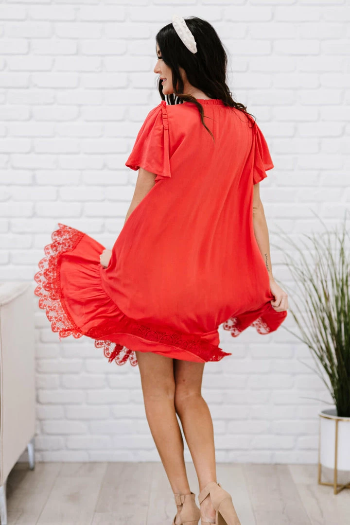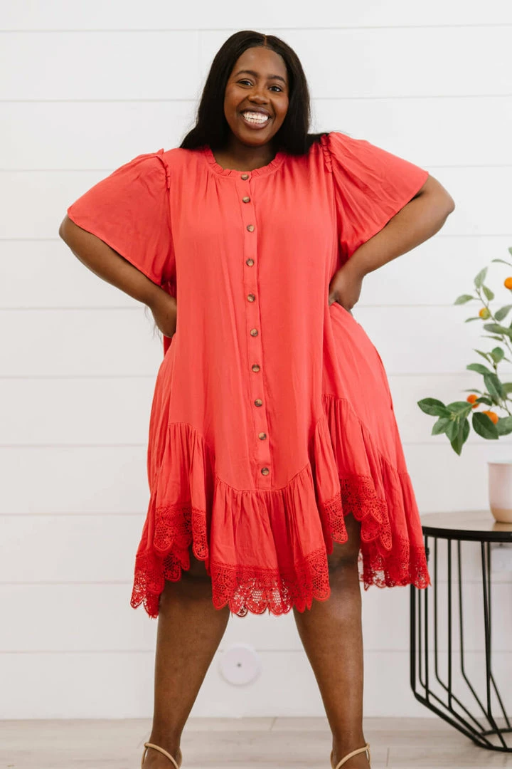 The design of this dress uses a flowy drape and a delicate crochet lace trim to make you feel like you’re flying through the clouds. Other noteworthy details include a unique asymmetrical ruffle hem, pleats, and buttons down the front.