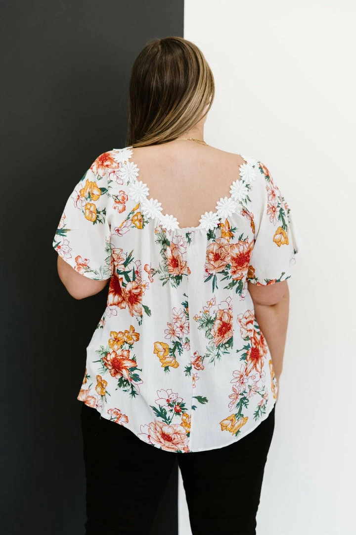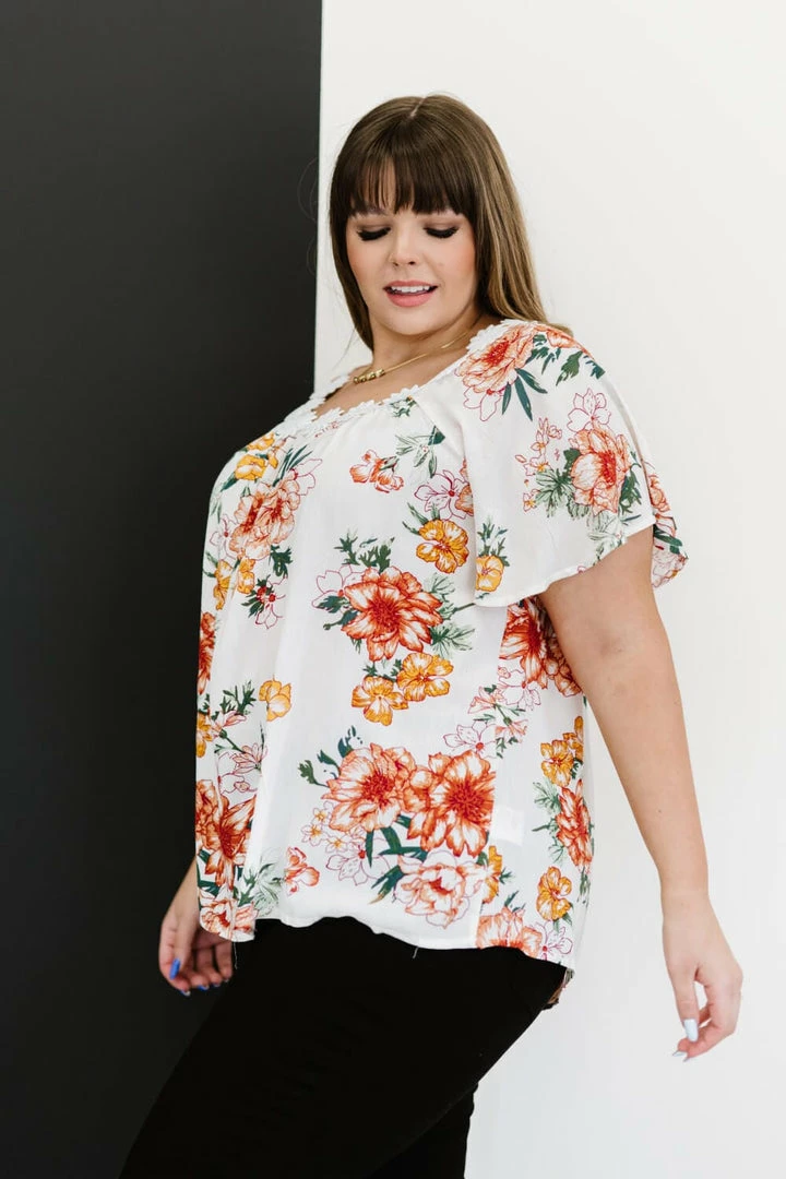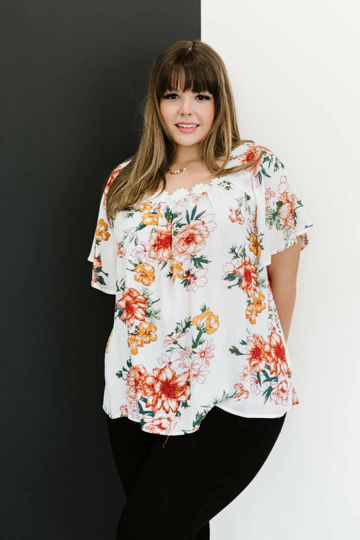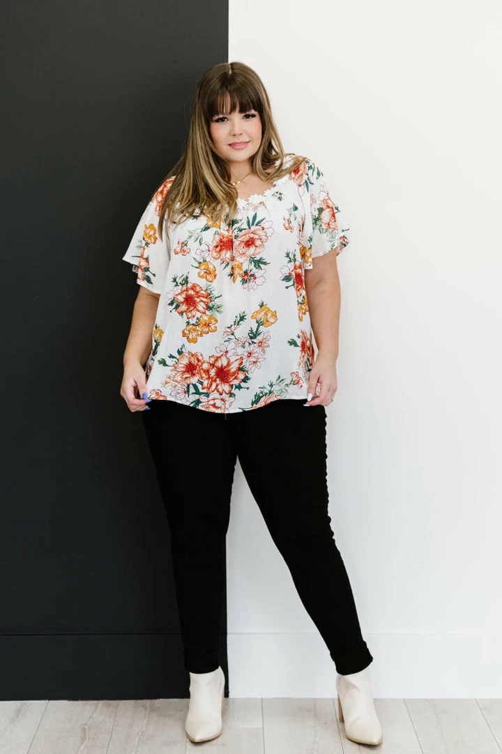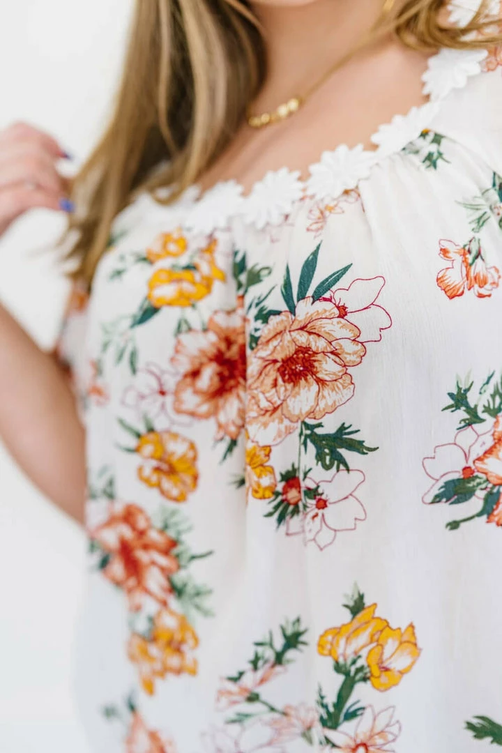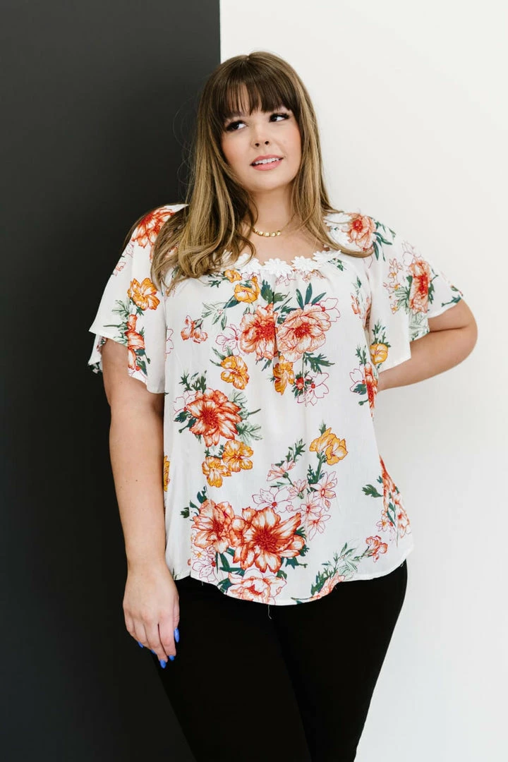 This woven top with a fabulous floral print has a magical detail along the neckline–a cute flower trim. The flutter sleeves and flowy design pair well with some shorts or some cropped jeans!