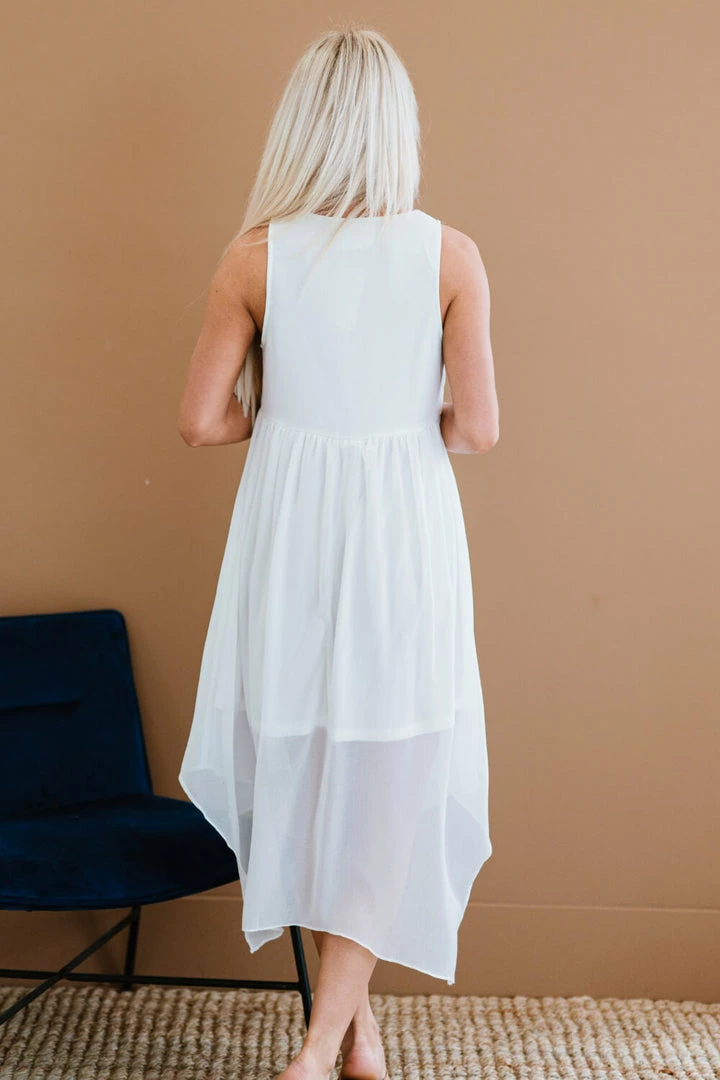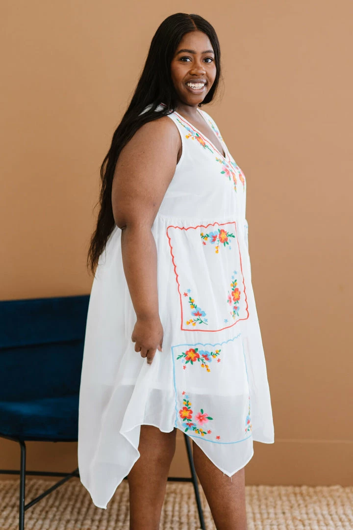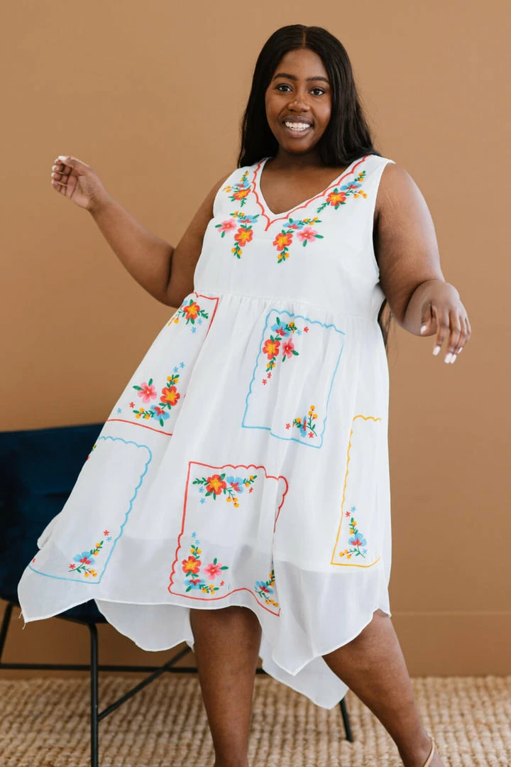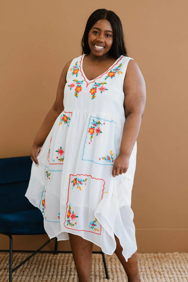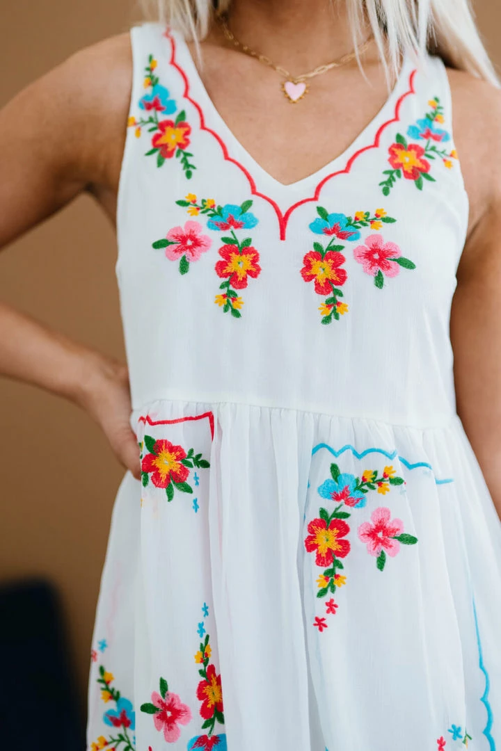 This dress gives off Mediterranean vibes with its floral embroidery on a sheer white midi dress with a lining. Wear it outside to enjoy the warm weather and a bit of sangria.
