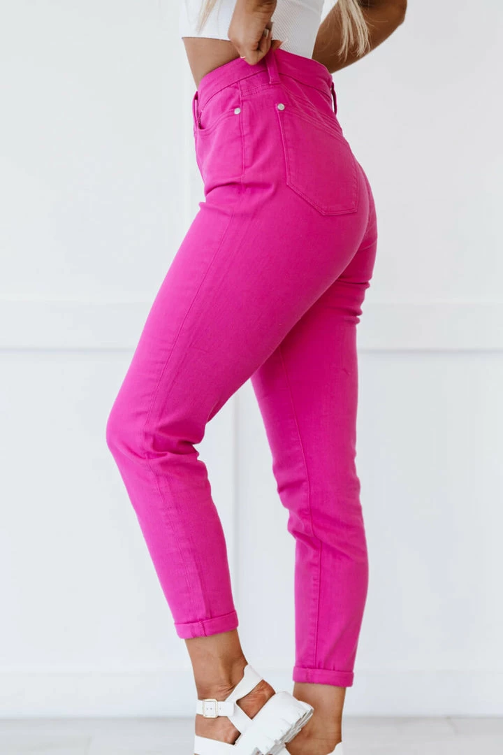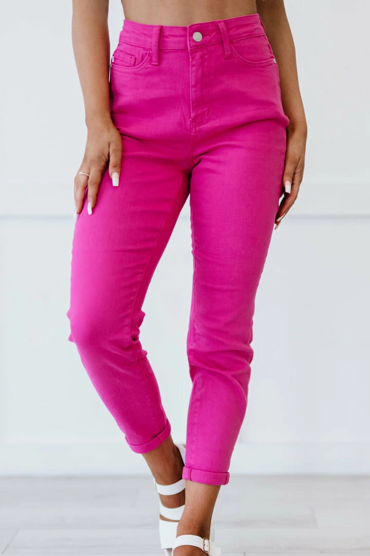 Bring your look to life with these neon slim fit jeans! A semi-relaxed fit will make sure you stay comfortable, along with loads of flexibility built into the fabric. A high rise and cuffed hem at the ankle add finishing touches. Try out a color block moment with a complementary color top, or go for a monochrome look.