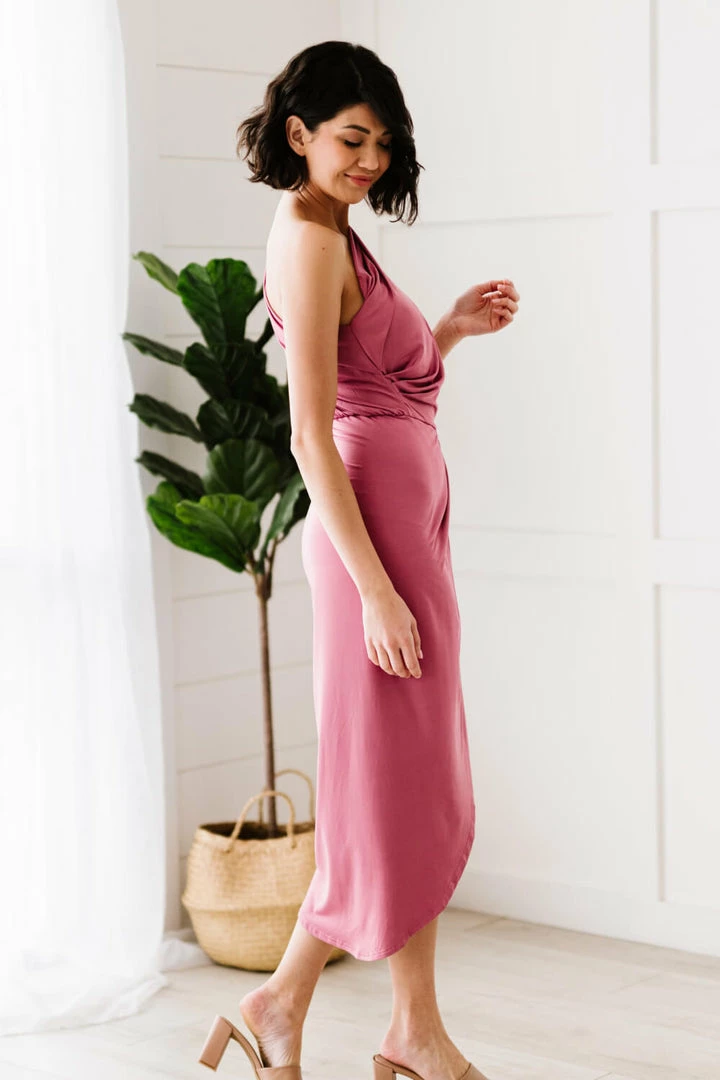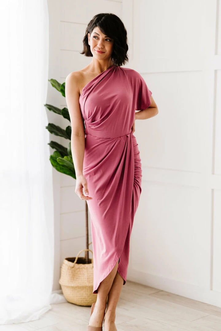 This dress is ideal for an elegant outing to botanical gardens or an art gallery. Featuring a rushed tulip hem and a one-shoulder design, this dress will become one of your favorites.