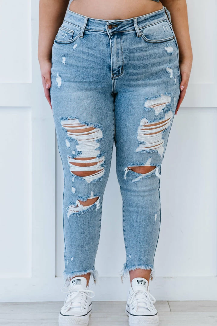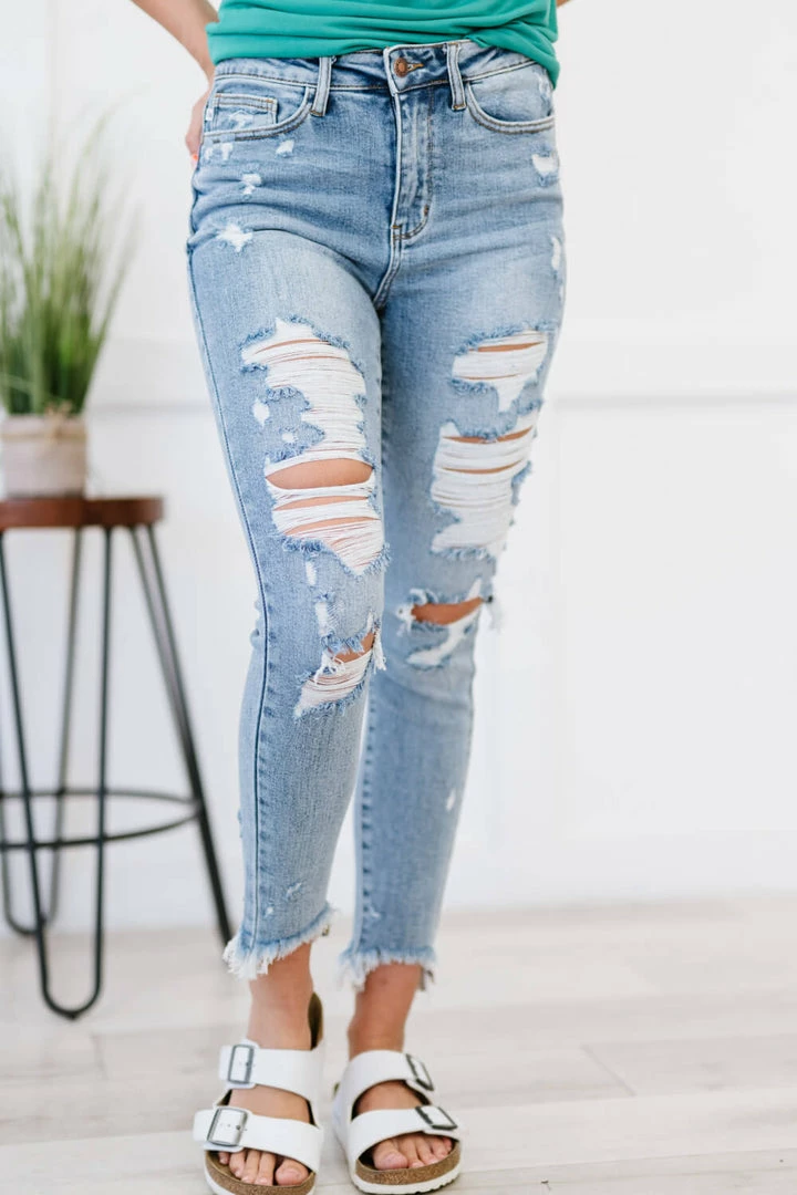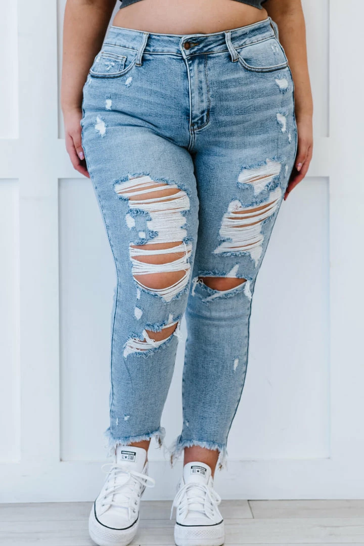 Made with stretch denim, these jeans come in a beautiful light wash and have a bit of edginess added to them with a frayed shark-bite hem and distressing. The high rise will flatter your figure by accentuating your waistline and creating curves. Style the jeans with a tank, tuck in an oversized top or wear your favorite graphic tee.