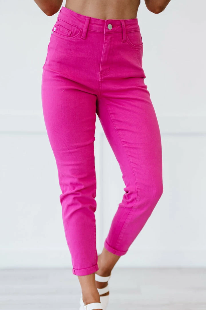 Bring your look to life with these neon slim fit jeans! A semi-relaxed fit will make sure you stay comfortable, along with loads of flexibility built into the fabric. A high rise and cuffed hem at the ankle add finishing touches. Try out a color block moment with a complementary color top, or go for a monochrome look.