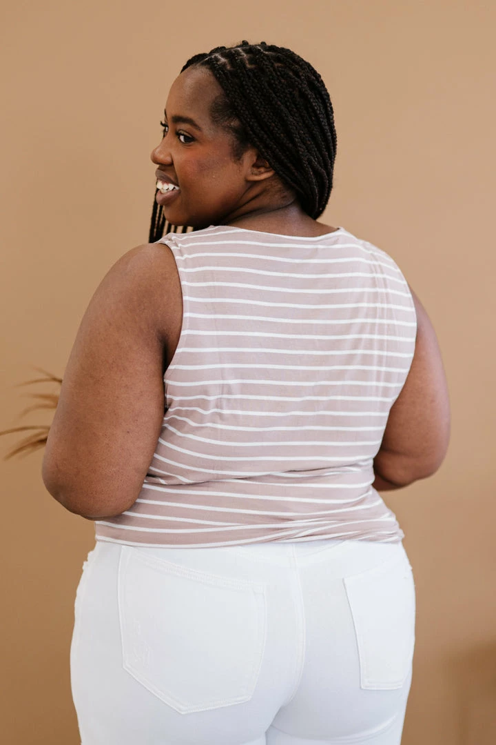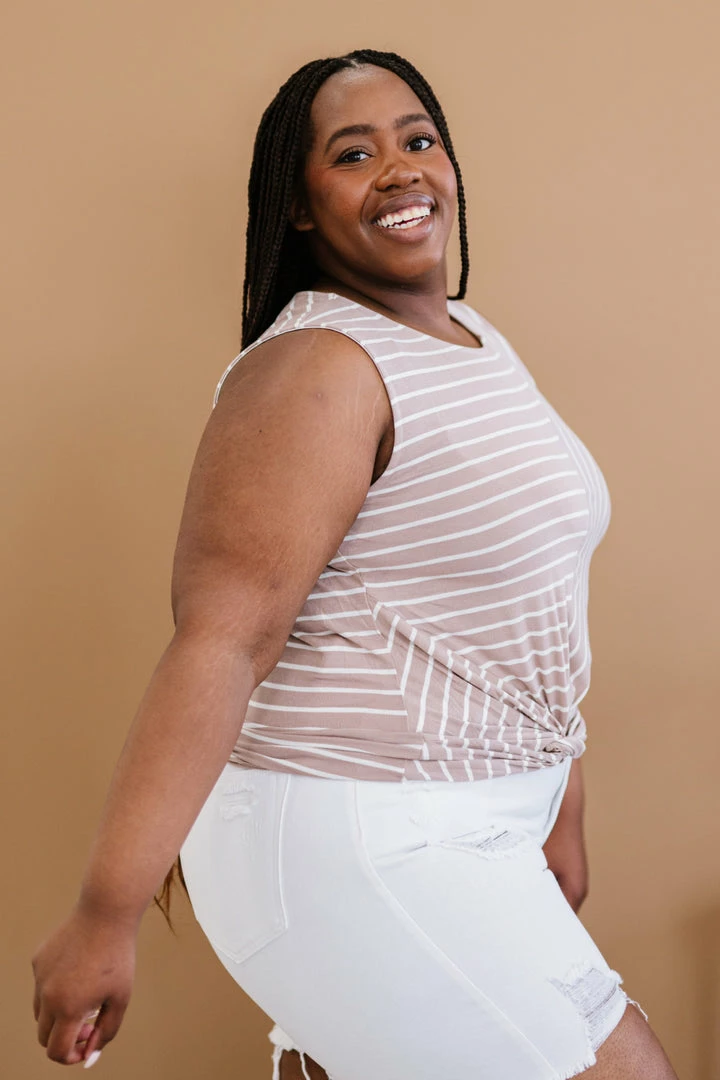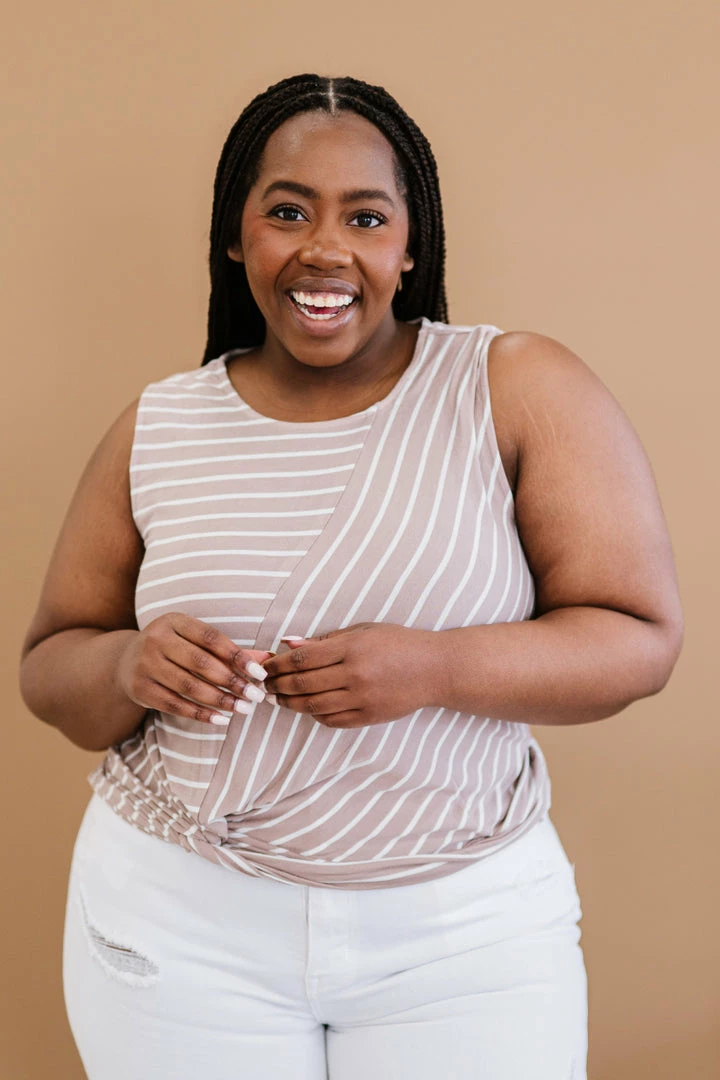We love this directional striped tank with a twist detail! Wear it under a cardigan, denim jacket, or by itself, and pair with bottoms of your choice! You can’t go wrong with this simple tank top.