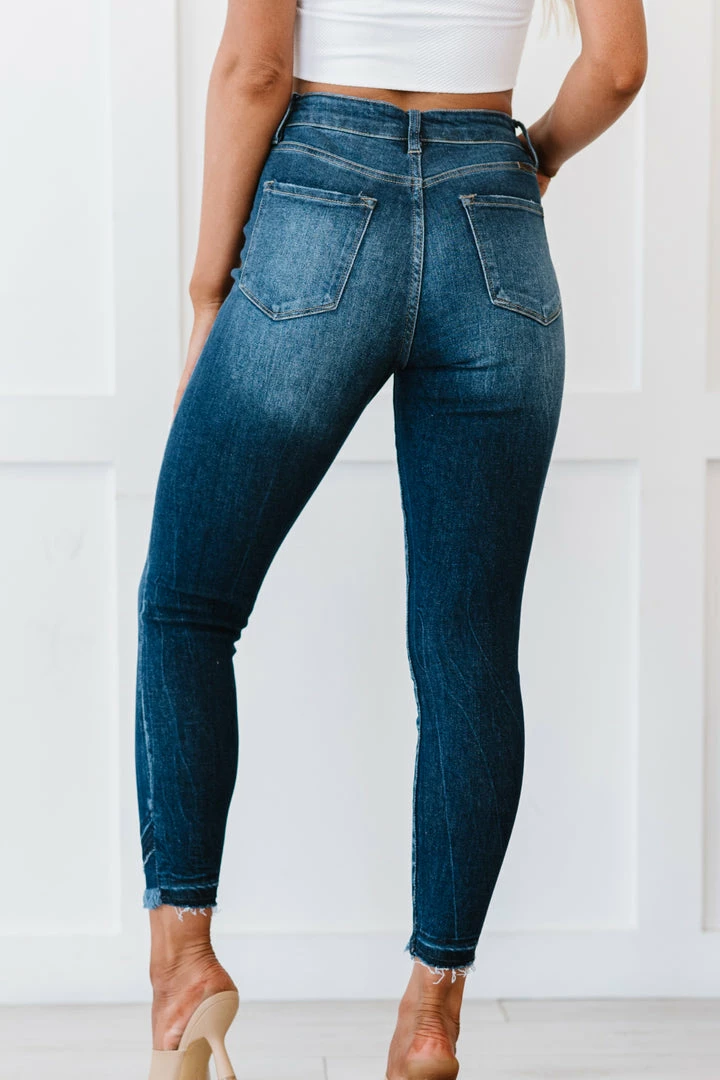 Classic dark-wash skinny jeans get a new look with a cute frayed diagonal detail at the hem. Since they’re so versatile, you can pair these with an easy tee or with a dressier top.