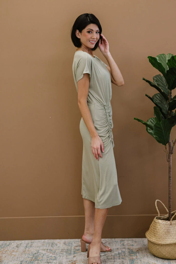 Are you looking for the perfect date night dress? Look no further! This one has a boat neck and beautiful ruching on the side starting at the waist. It comes in a gorgeous green color and is soft and stretchy knit fabric. Add some black strappy heels and some sparkly jewelry for a romantic evening!