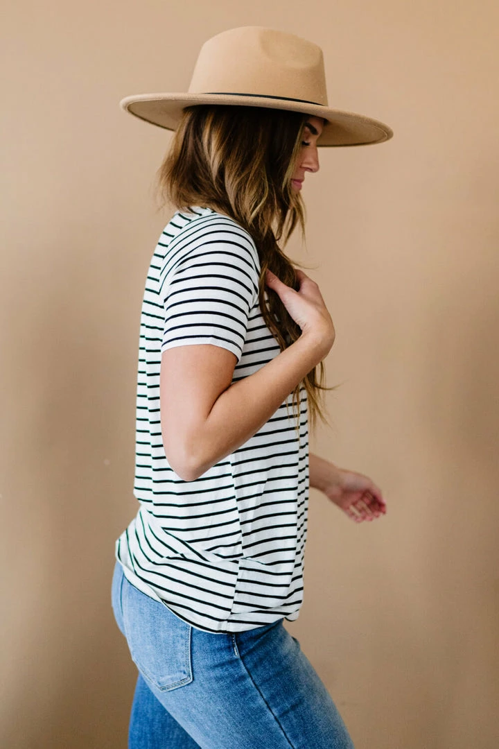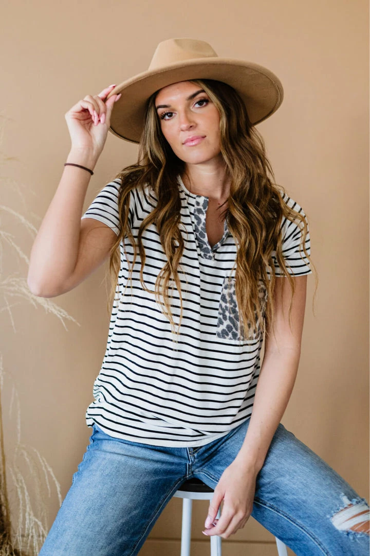 This super stretchy striped half-sleeve tee with a leopard pocket and trim can be worn around the house or out shopping, for a bite to eat, or running errands, and could even be dressed up with a blazer or some sequin bottoms. The notched neckline is ultra flattering for all body types.