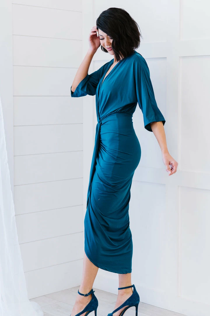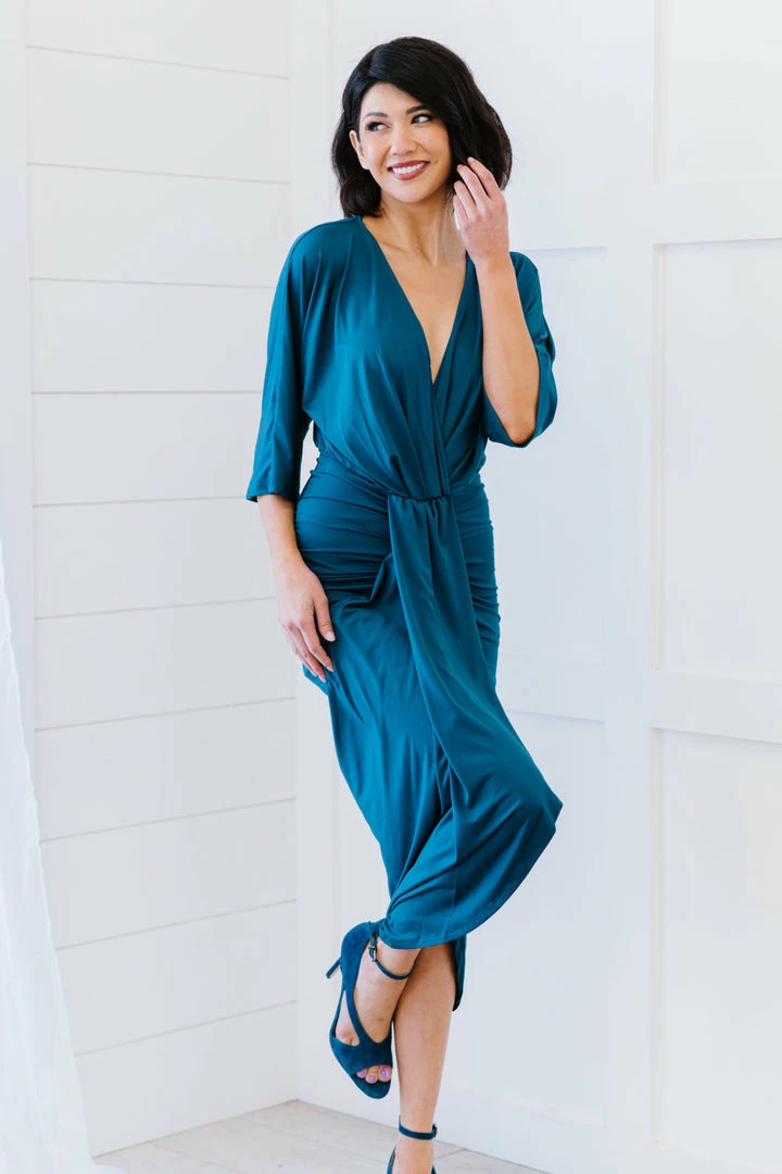 Whatever the event, this dress has got you covered! With gorgeous ruching and a high-low petal hem, the Ocean Teal Ruched Dress by Dress Day will keep you confident.