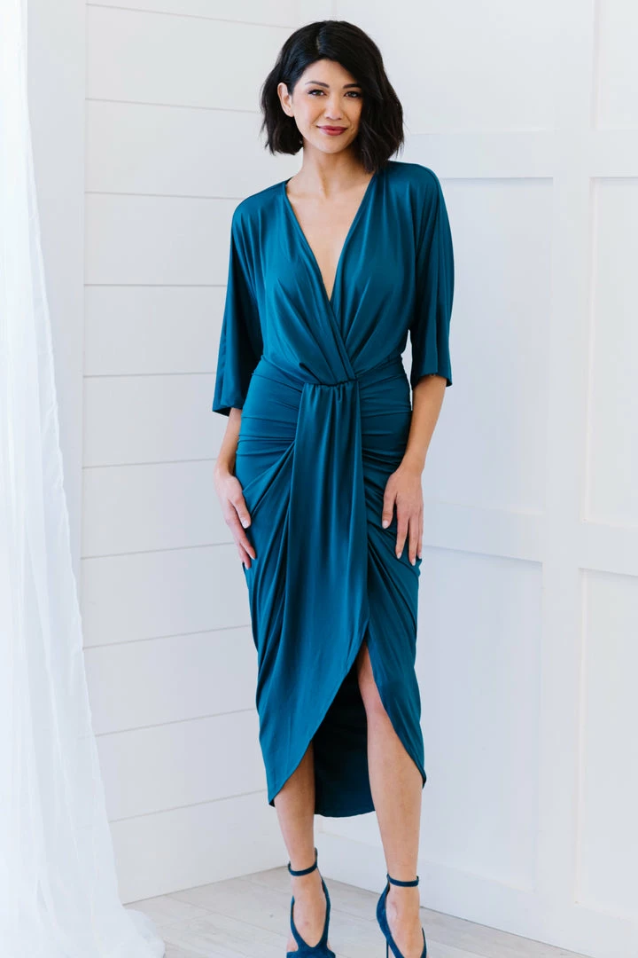 Whatever the event, this dress has got you covered! With gorgeous ruching and a high-low petal hem, the Ocean Teal Ruched Dress by Dress Day will keep you confident.