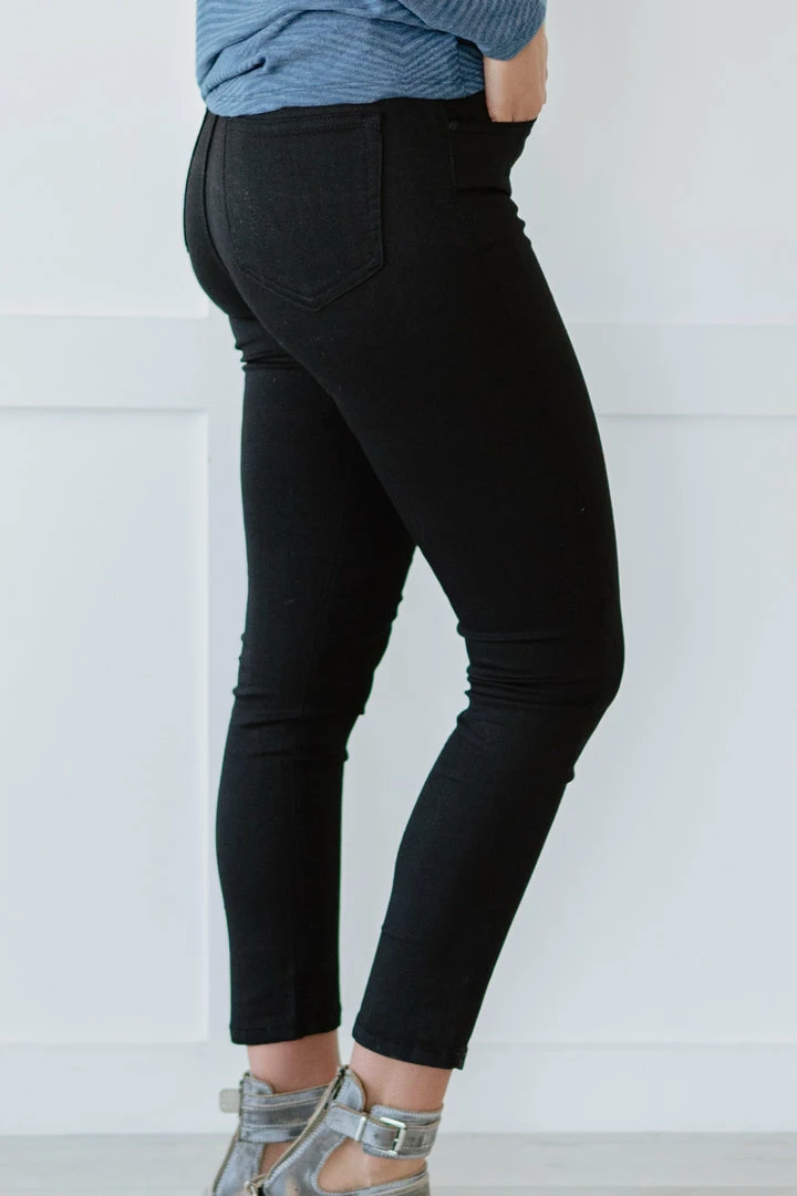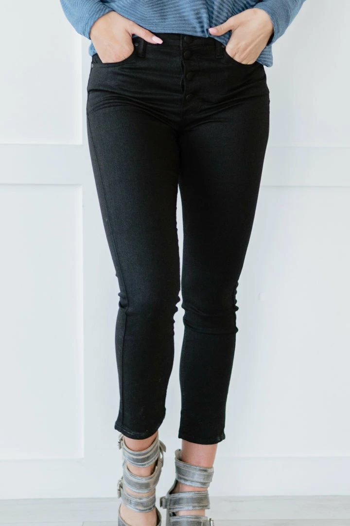 - Features: Button fly, skinny, ankle-length