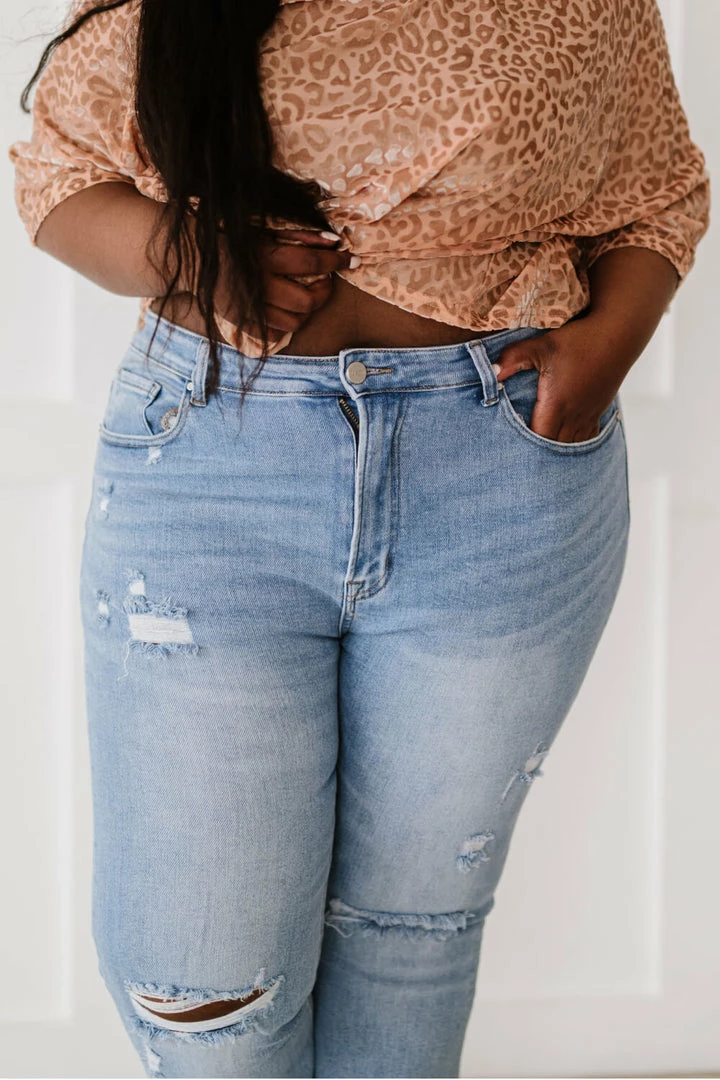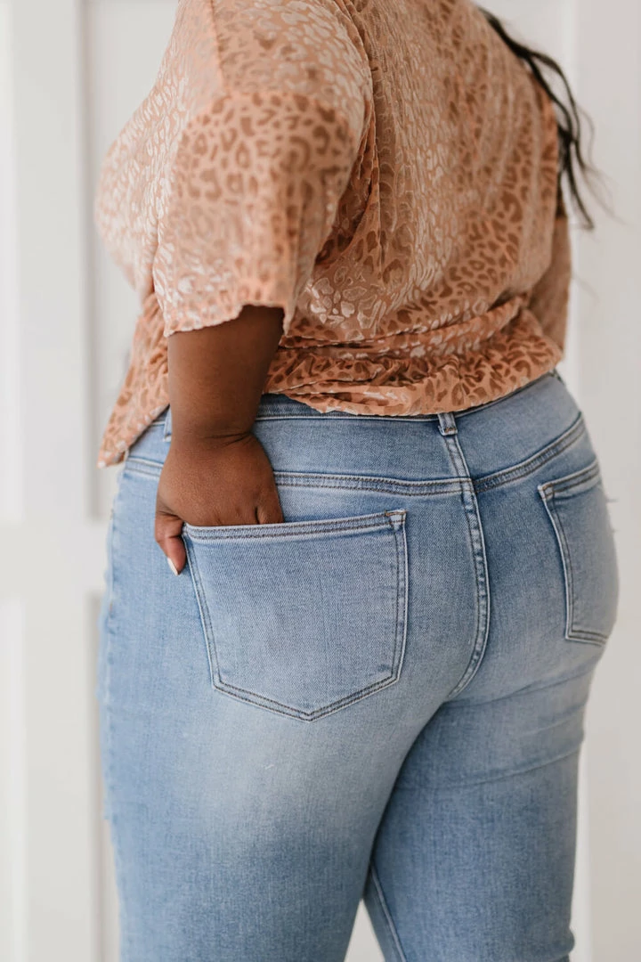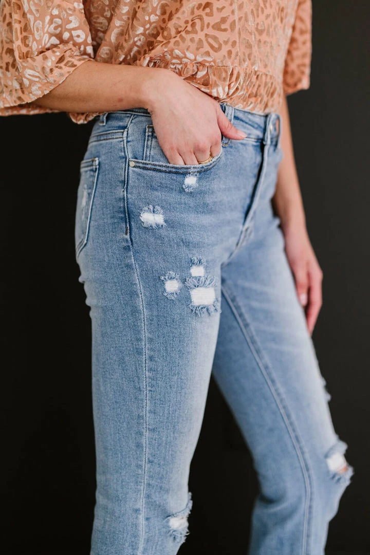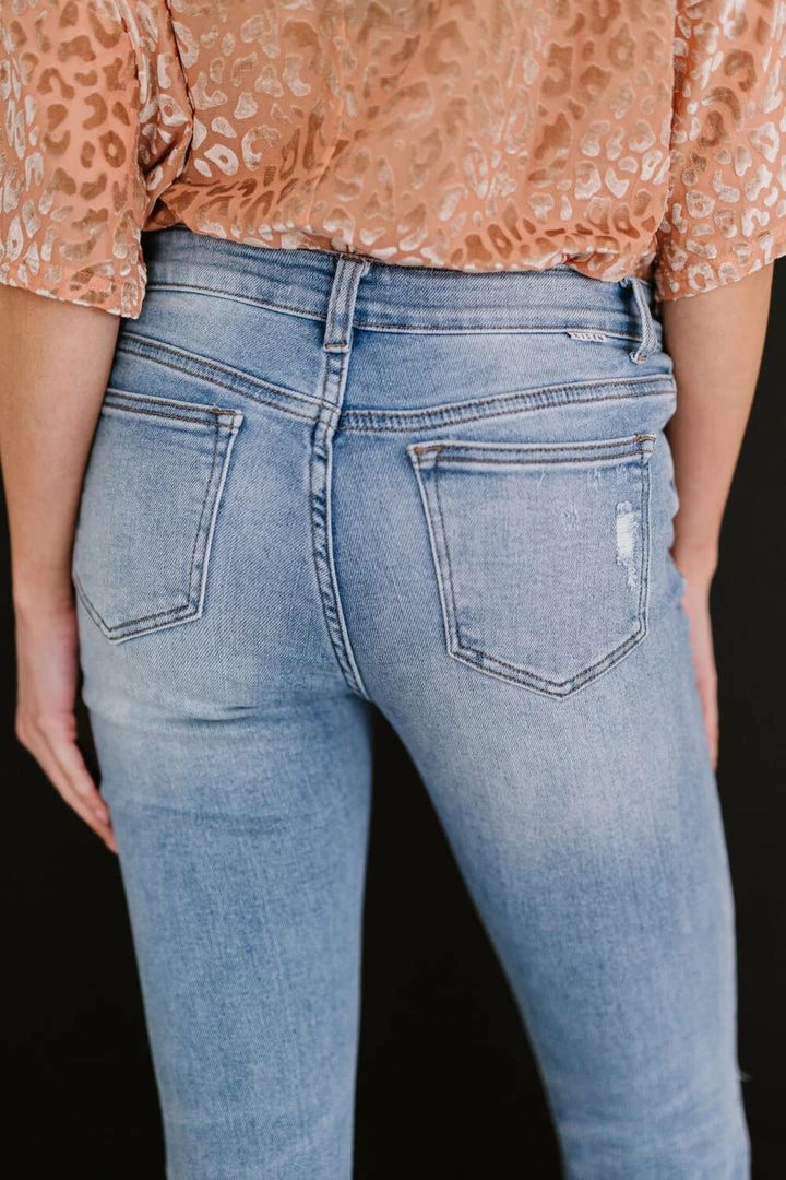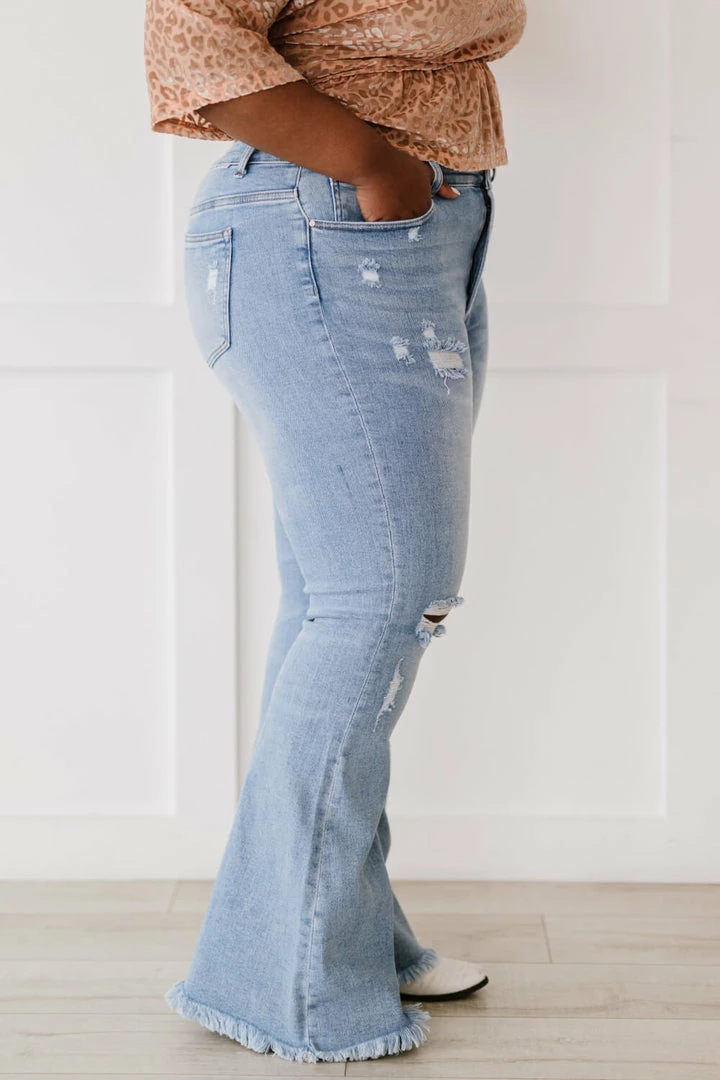 Suit up in style with these trendy and modern jeans! The mid rise sits just right, snatching in your waist and hugging your hips. The long inseam ends in a slight flare with a raw hem. And to top it all off, the light wash has a touch of distressing for an updated finish.