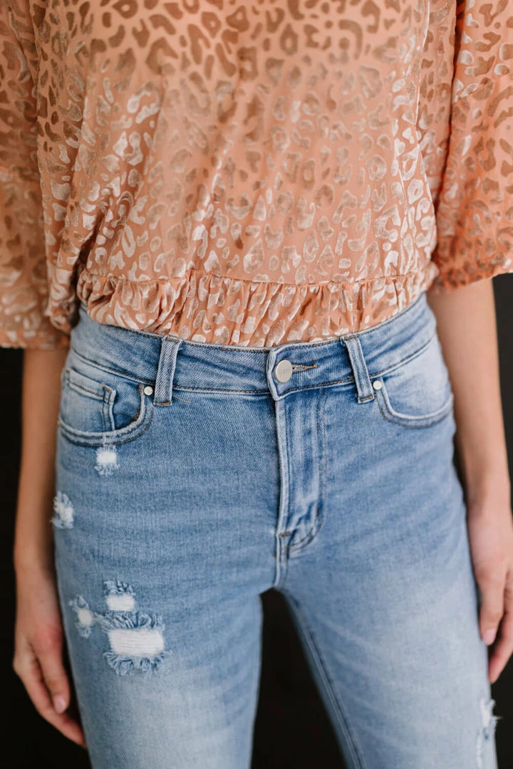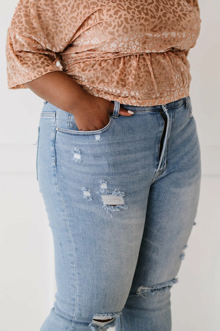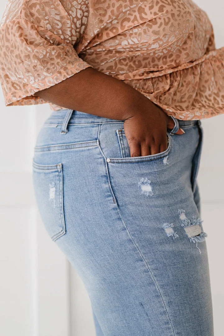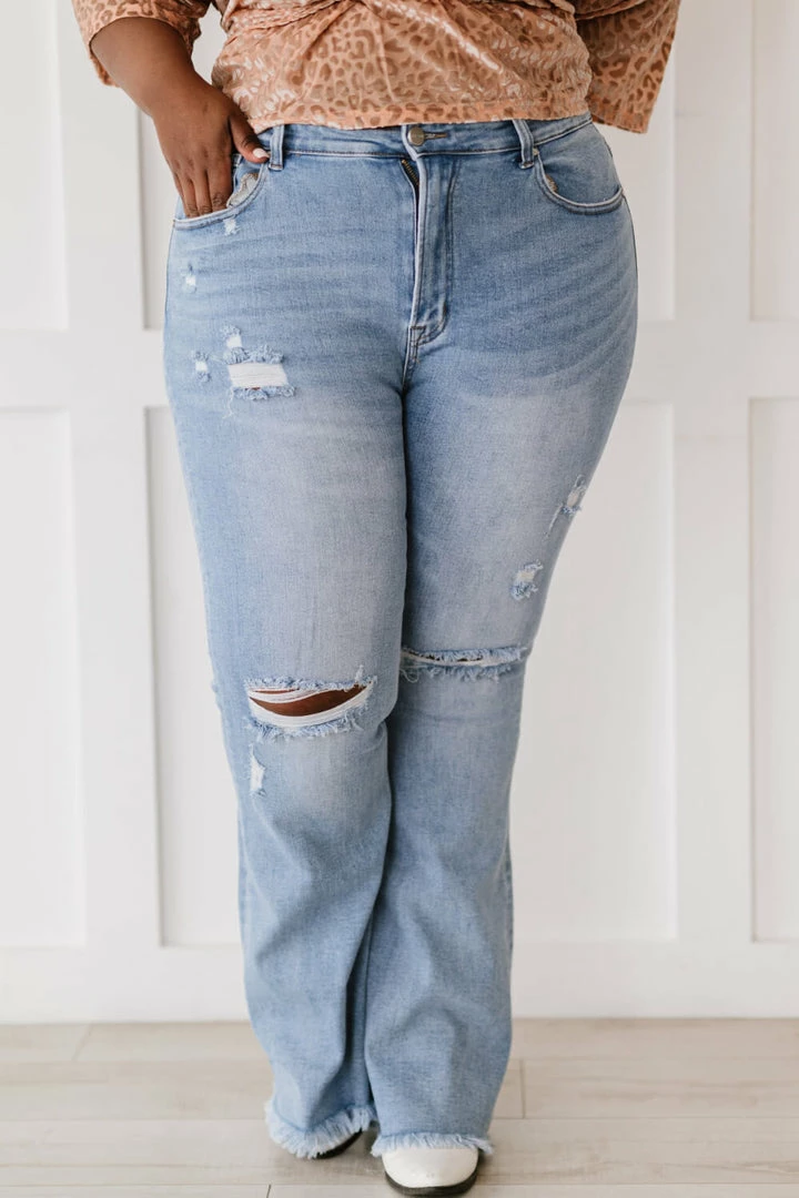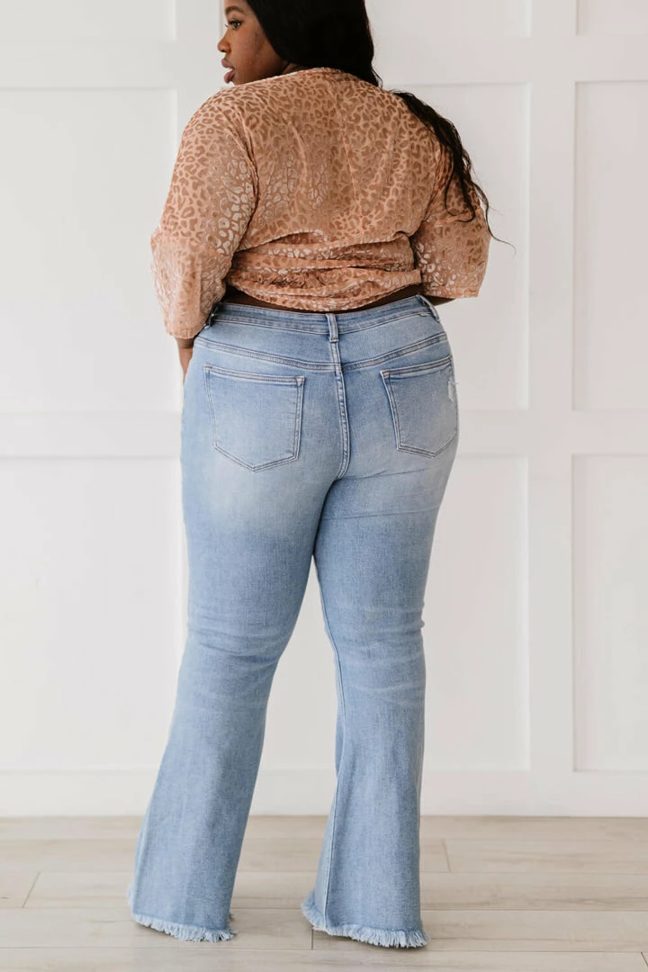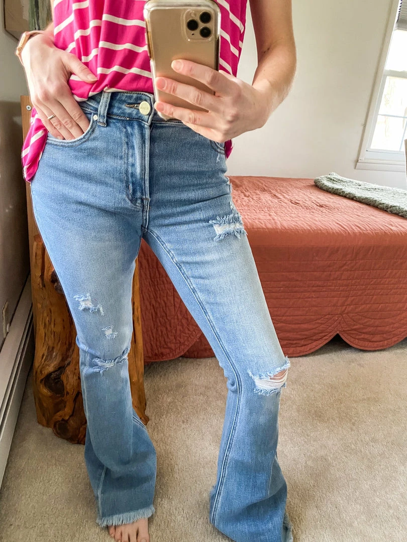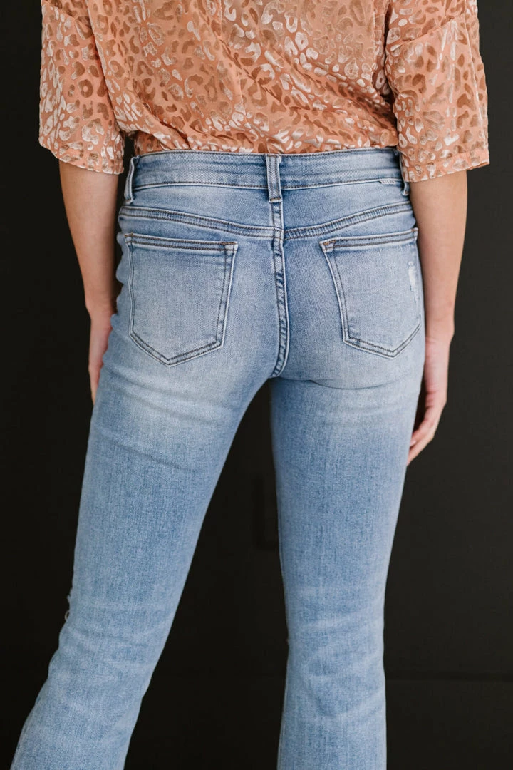 Suit up in style with these trendy and modern jeans! The mid rise sits just right, snatching in your waist and hugging your hips. The long inseam ends in a slight flare with a raw hem. And to top it all off, the light wash has a touch of distressing for an updated finish.