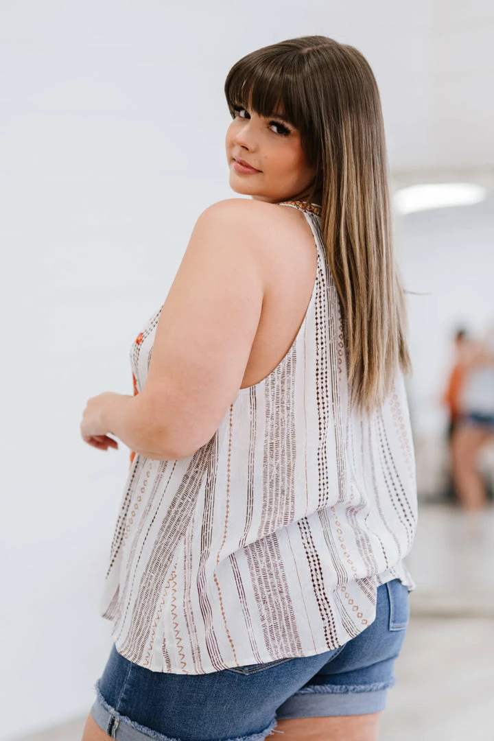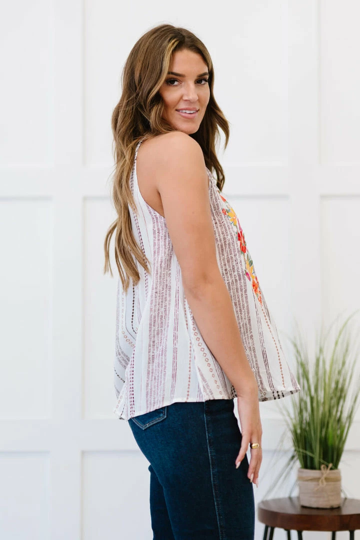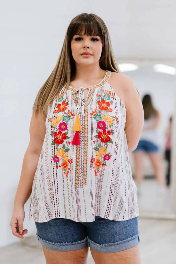 This embroidered sleeveless blouse was made with sunshine, flowers, and love. The cute neckline is complemented by mismatched tassel ties that add a whimsical touch.