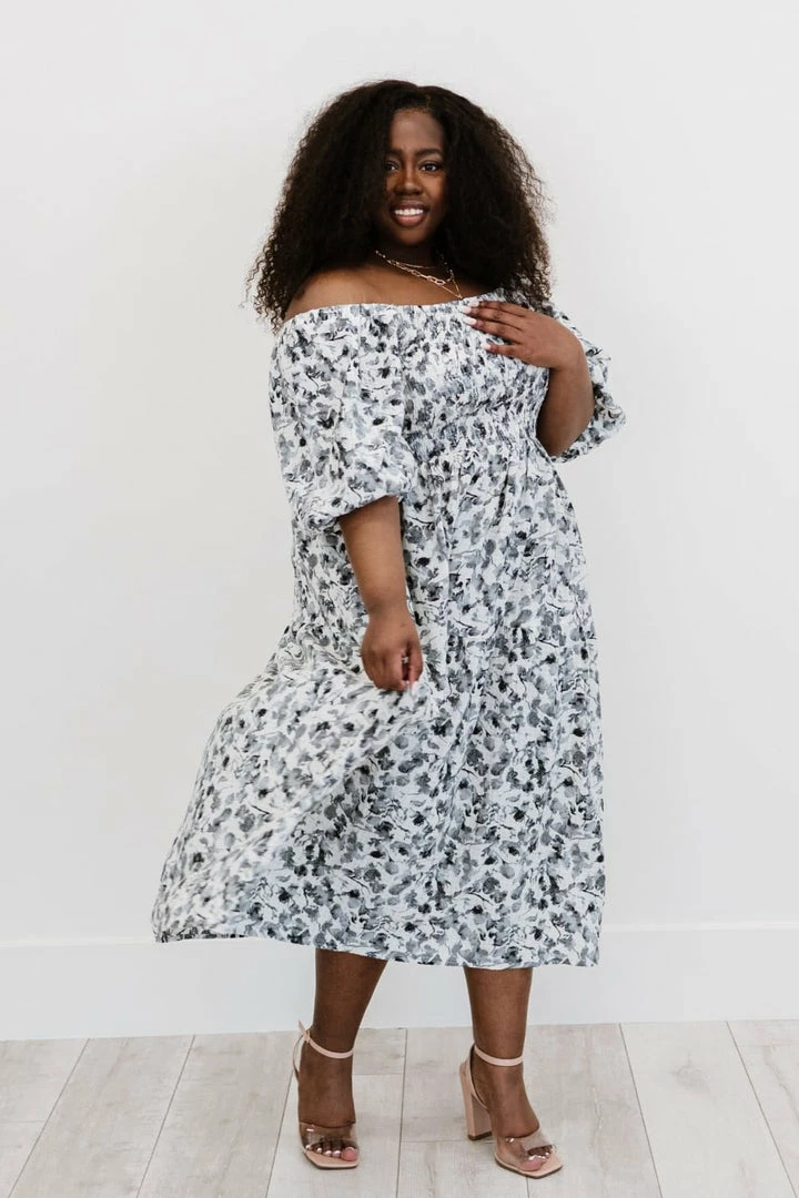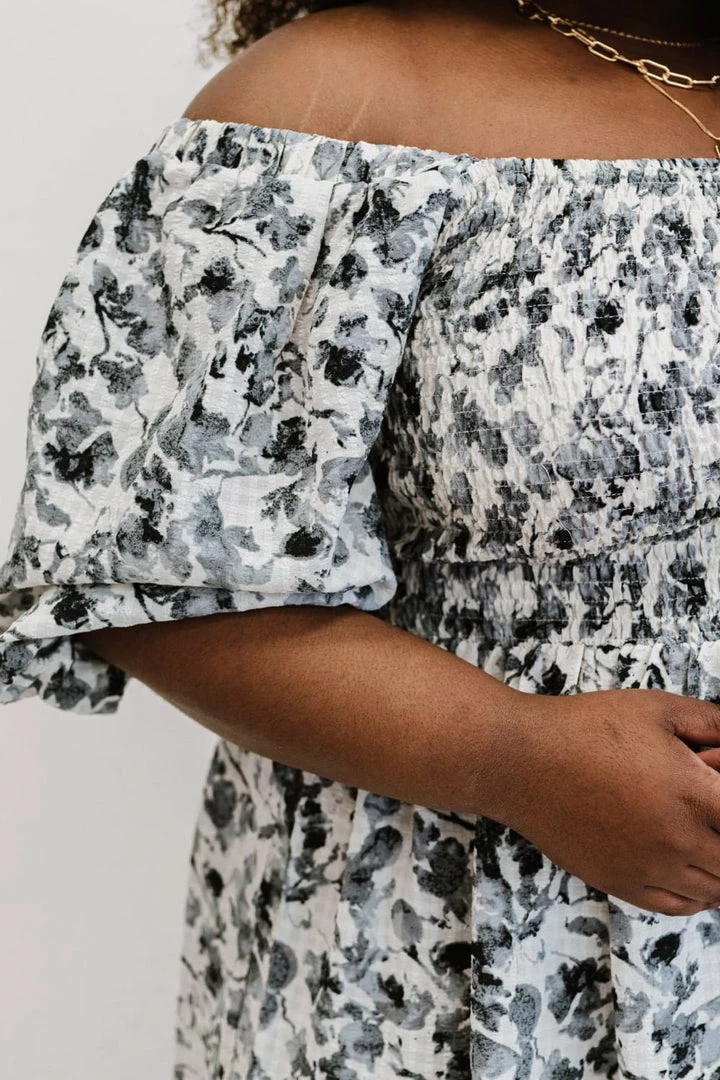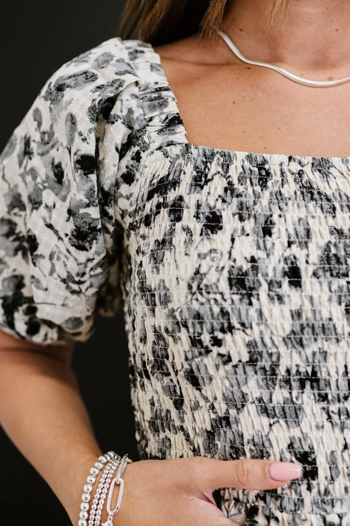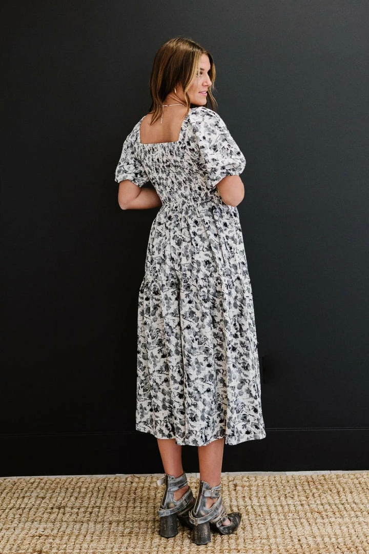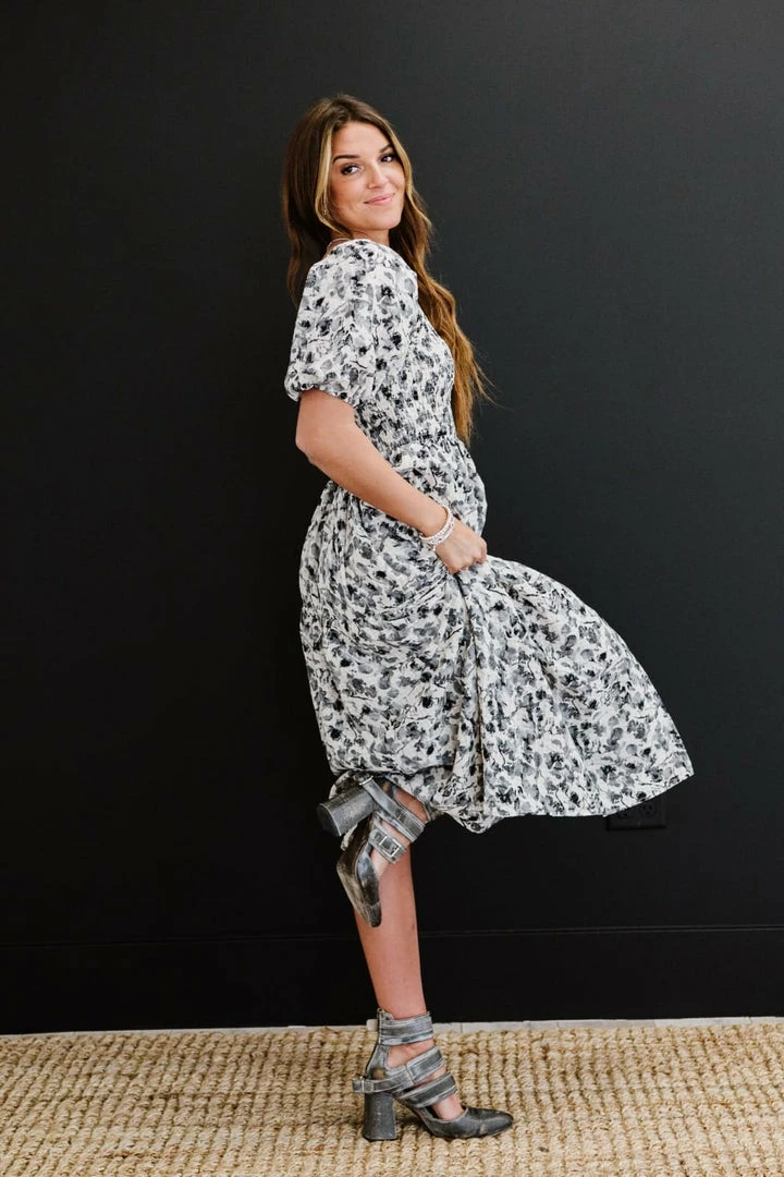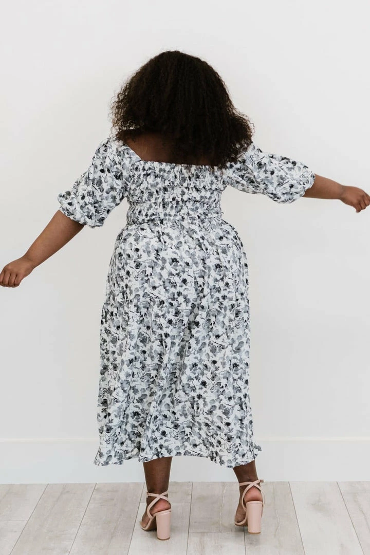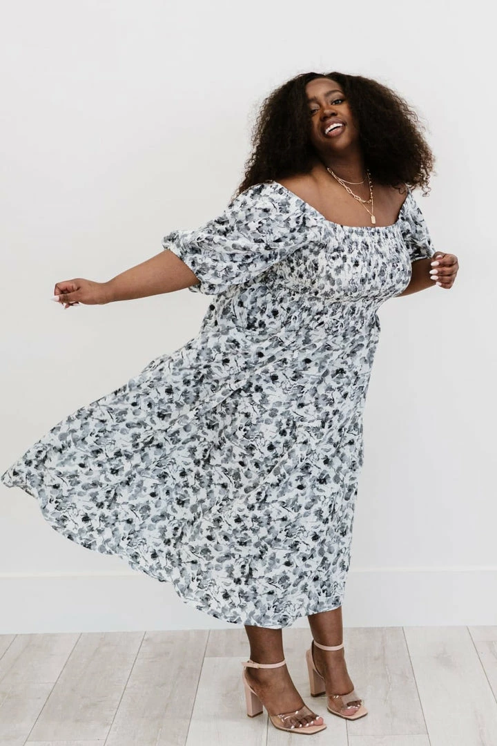 You’ll feel simply smitten whenever you wear this full-size run smocked dress with puff sleeves, which is elevated with an elegant black and ivory floral print on top of a very subtle gingham. While the fabric itself isn’t stretchy, the bust and elasticated sleeves are.