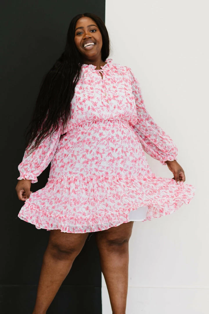 The beauty is in the details with this dress! A floral print, Swiss dots, and a textured chiffon which is lined on the bodice complement a tie neck and tiered skirt.