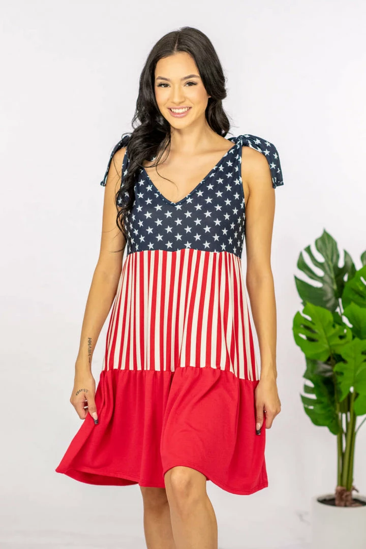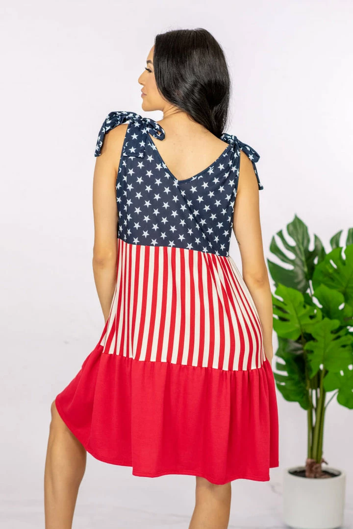 Spend your festivities frolicking around in this frock! With a patriotic tiered design and ties at the shoulders, this dress will receive compliments galore this Fourth.