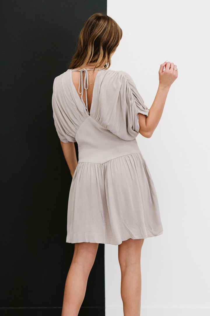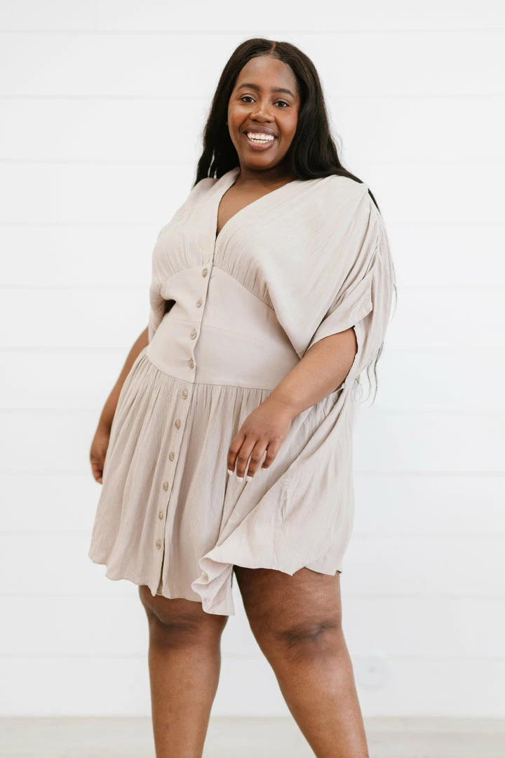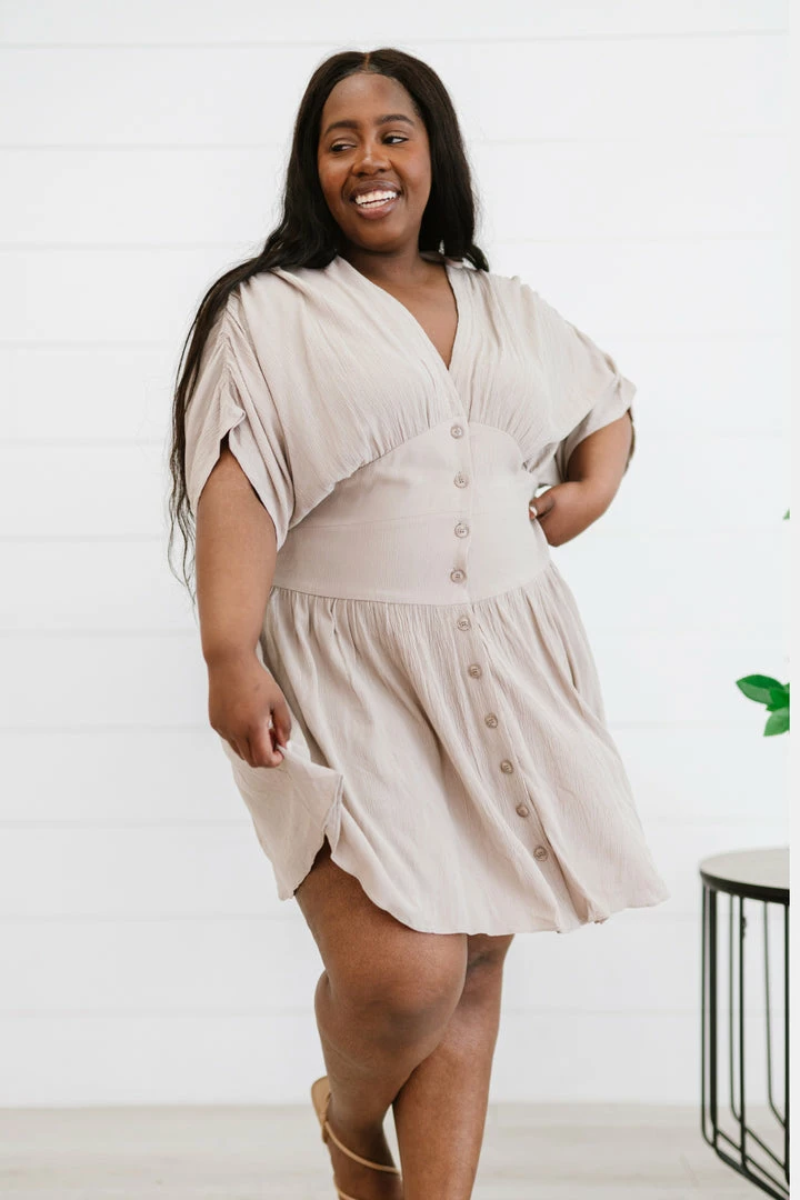 If you want a fresh new look, this dress could be exactly what you’re looking for! Pleats on the yoke and skirt contrast with a smooth bias cut waistline, and buttons adorn the front of the dress. In the back, the sleeves continue on to create a deep open V which is finished off with a tie at the neck.