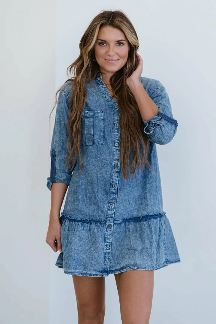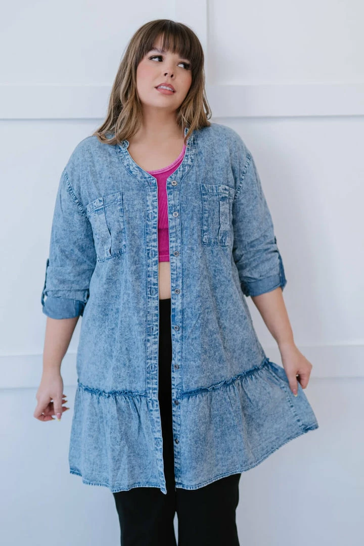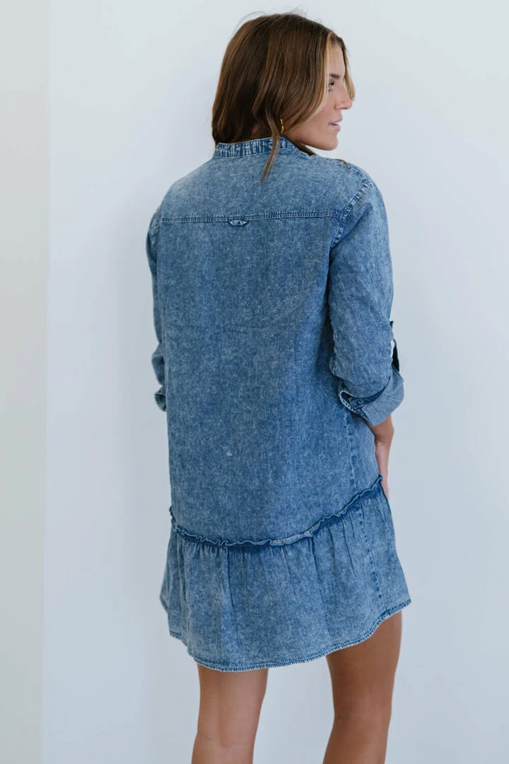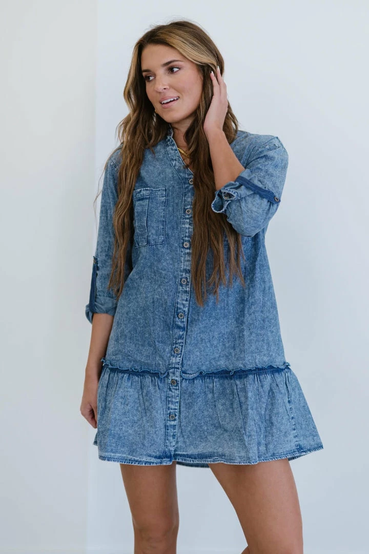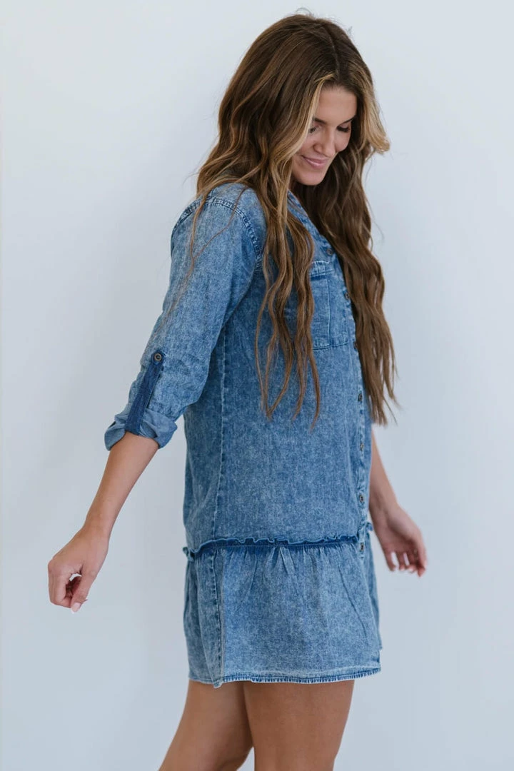 This dress is amazing! The button-down design can be styled as a dress, or you can unbutton it and wear it as a shacket, layered over a cute bralette. It has a bit of an oversized fit and comes in a subtle mineral wash to add a bit of edge to the feminine design. It also has a ruffle hem and roll-tab sleeves so you can adjust the sleeve length.