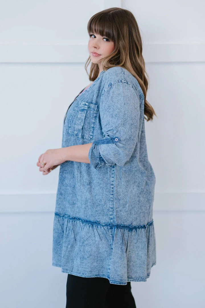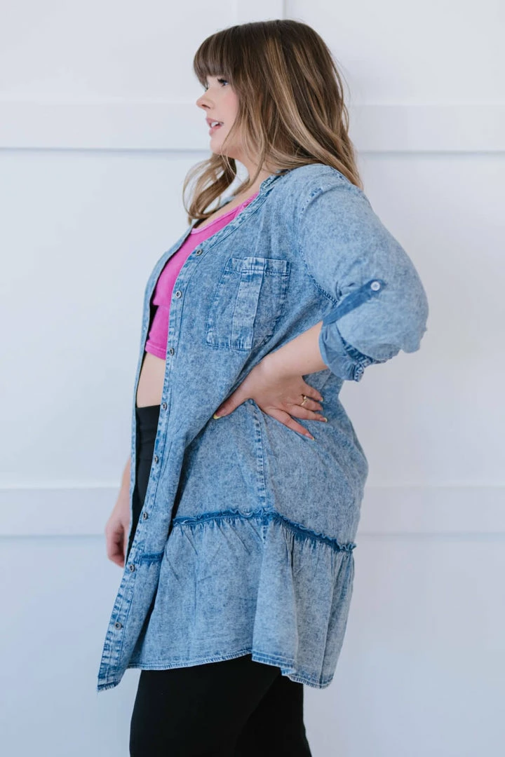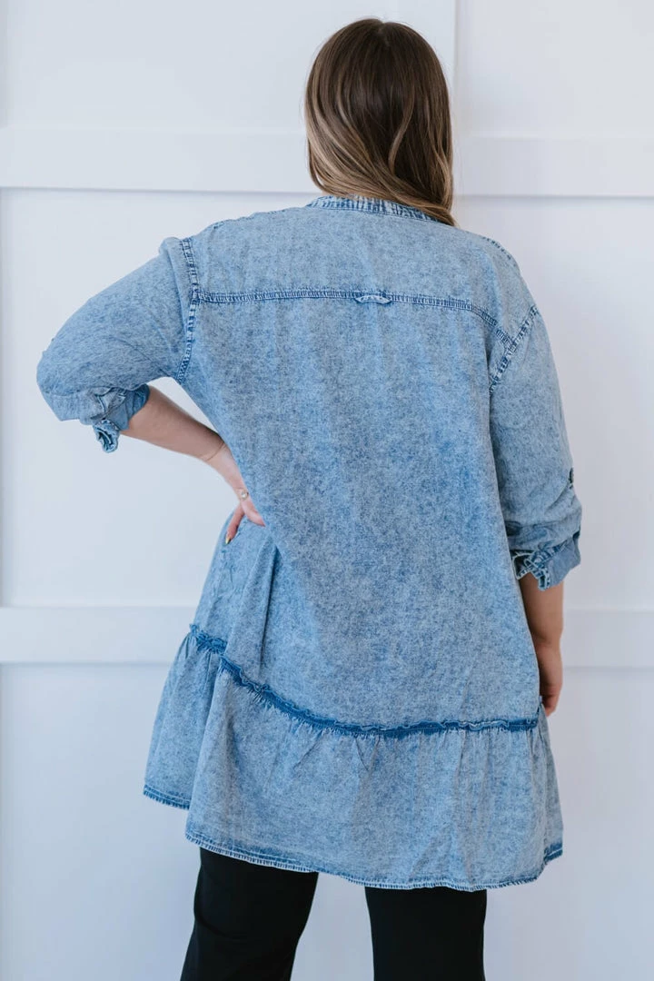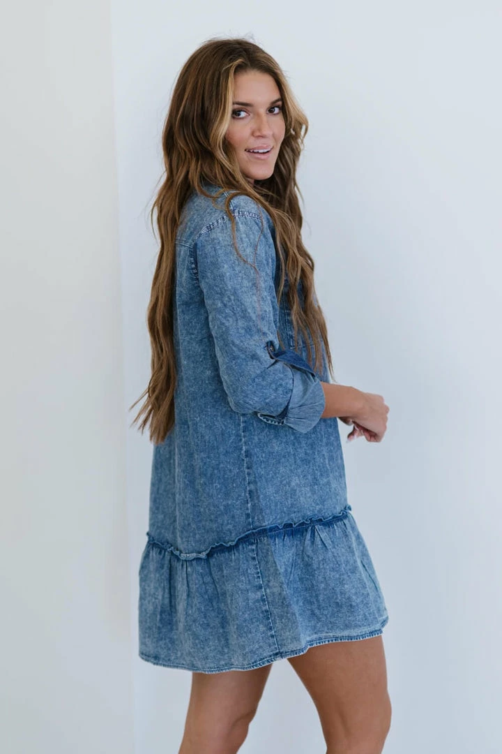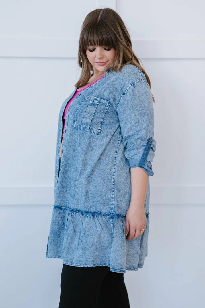 This dress is amazing! The button-down design can be styled as a dress, or you can unbutton it and wear it as a shacket, layered over a cute bralette. It has a bit of an oversized fit and comes in a subtle mineral wash to add a bit of edge to the feminine design. It also has a ruffle hem and roll-tab sleeves so you can adjust the sleeve length.