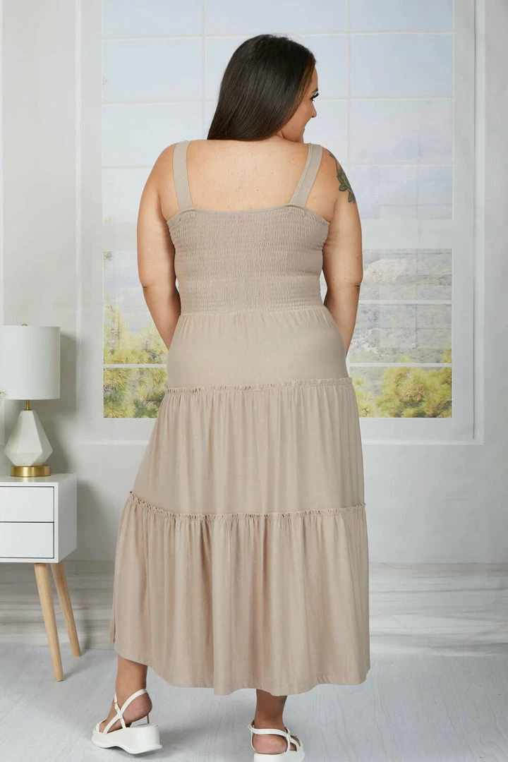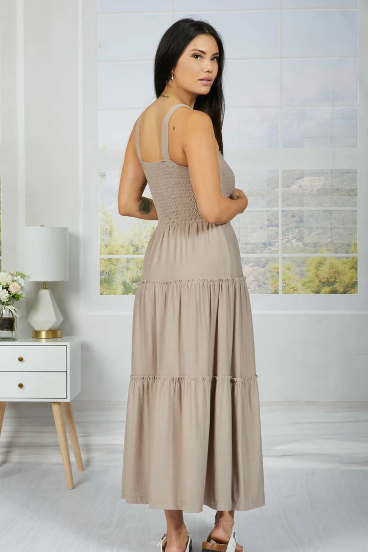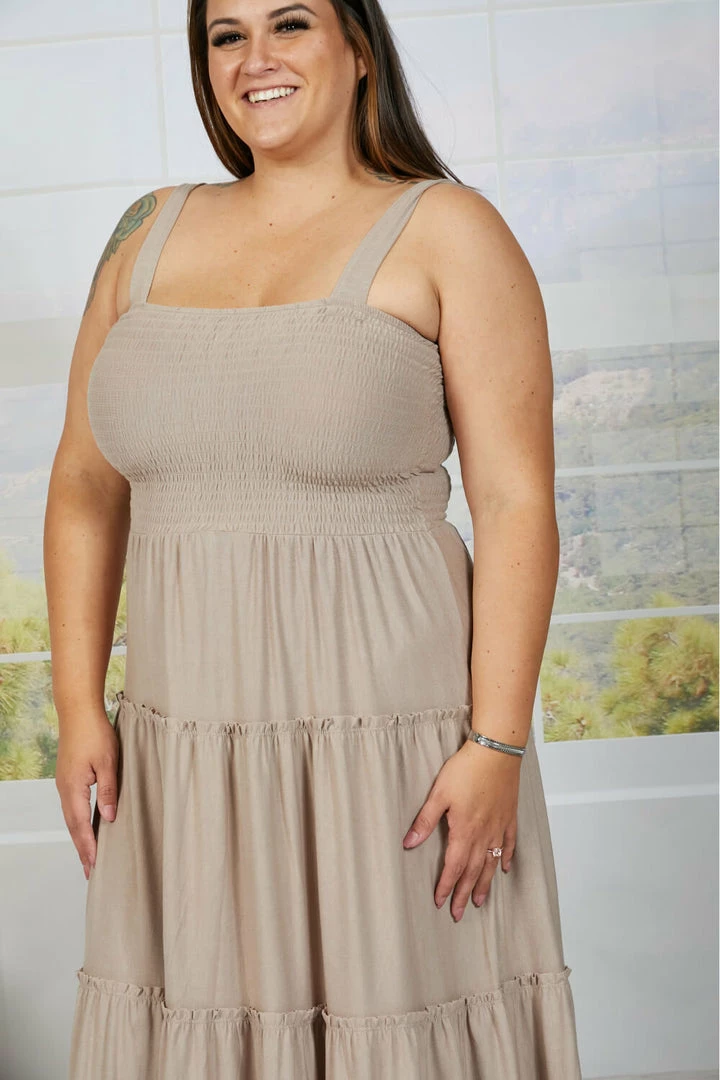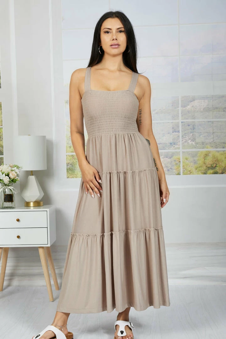 This sleeveless midi dress is sure to be a new favorite in your closet. The smocking at the bust flatters all, and the tiered design is right on trend.