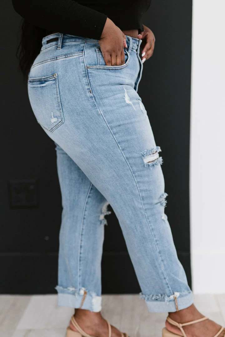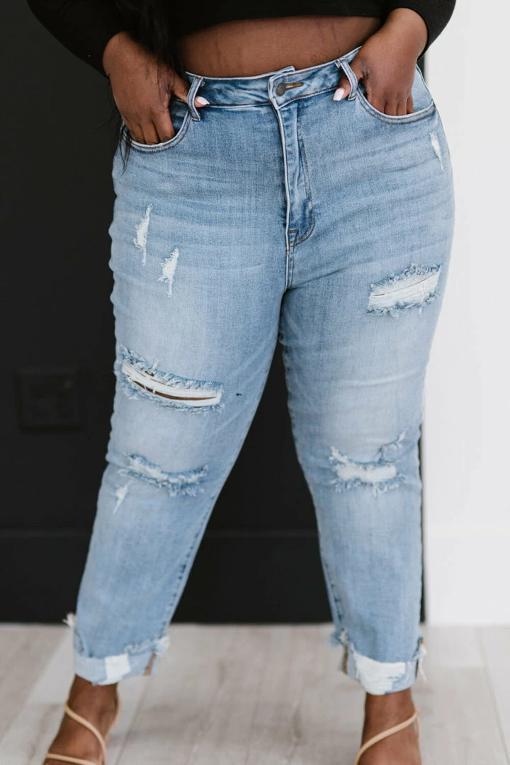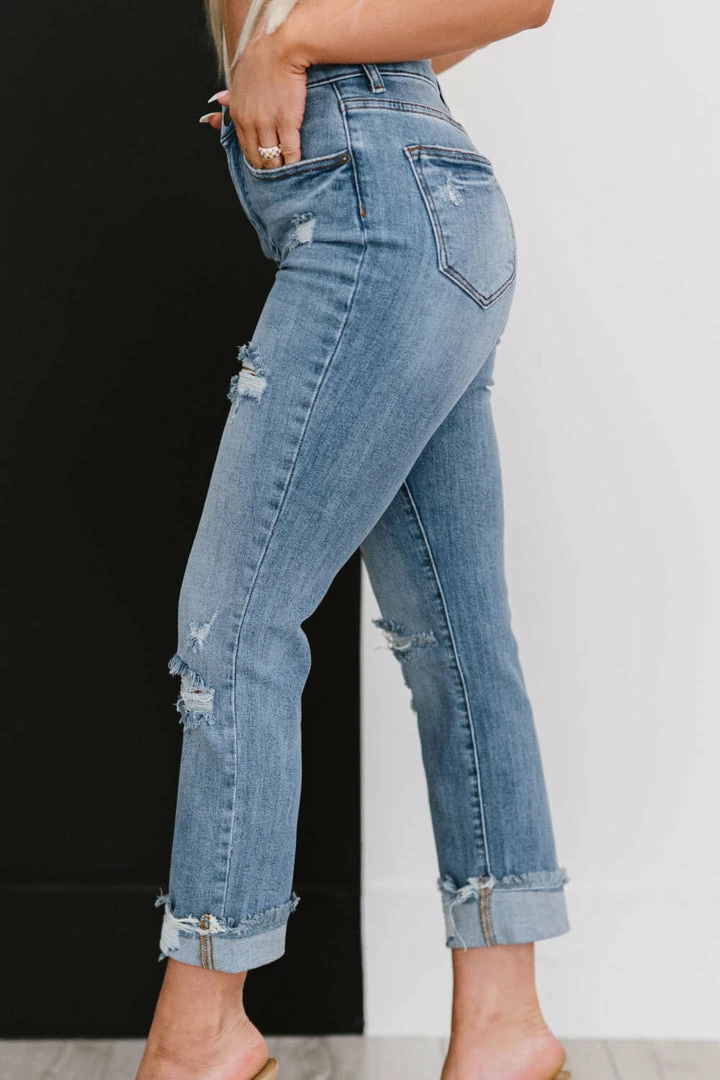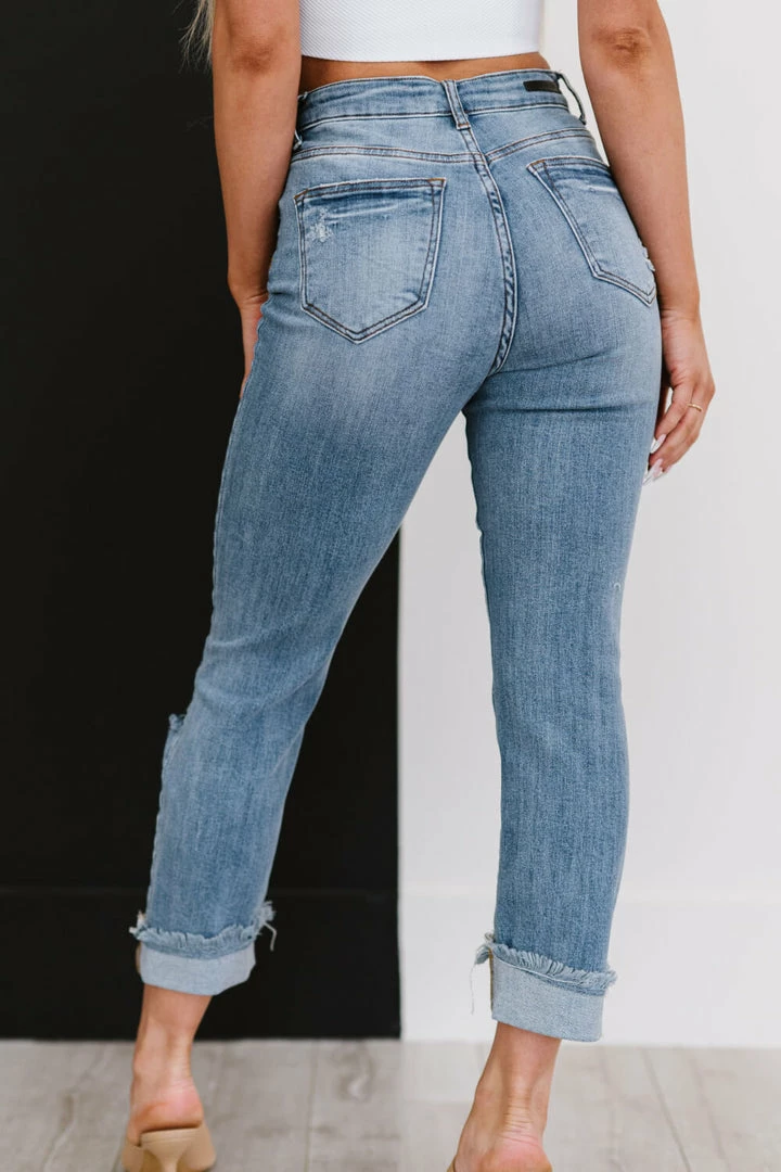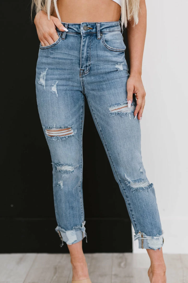 This cool medium wash on these jeans will really make you want to take it easy–along with the high stretch and distressing. These jeans are an absolute must-have. Pair them with a crop, tee, or a plaid button up.