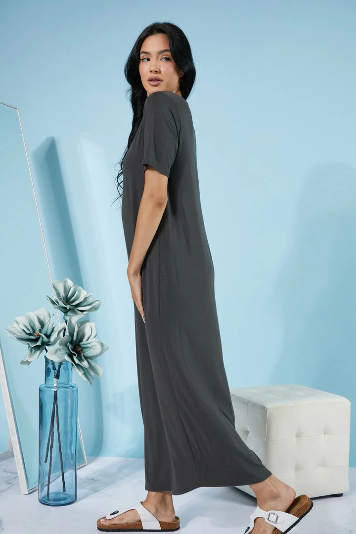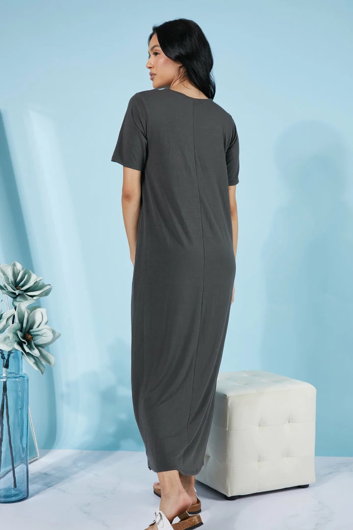 You can have comfort and style with this ankle-length t-shirt dress! Super soft fabric shapes a loose fitting dress, which can easily be dressed up or down.