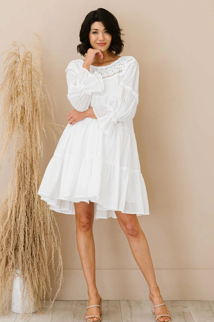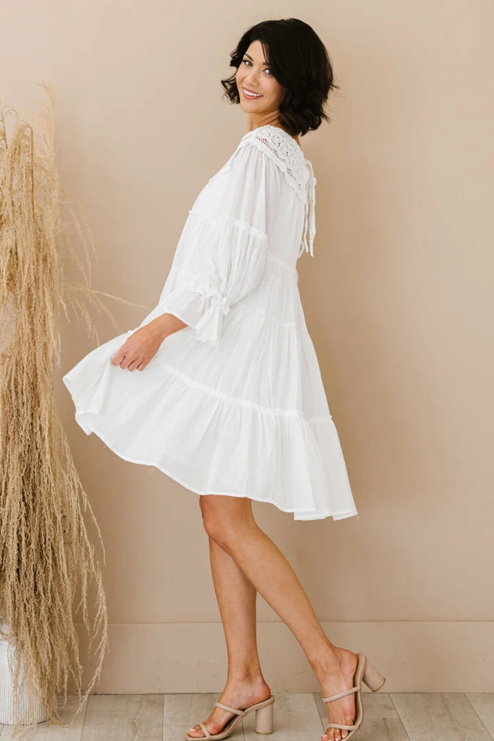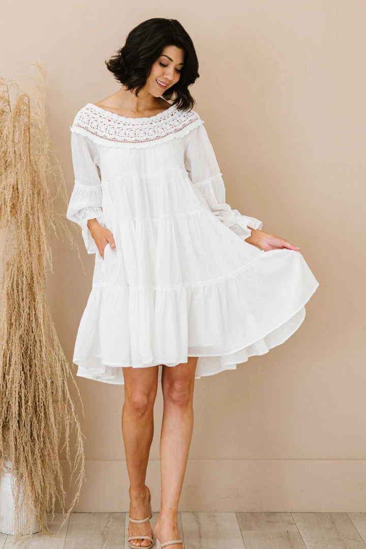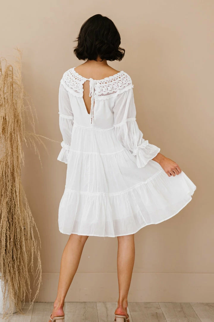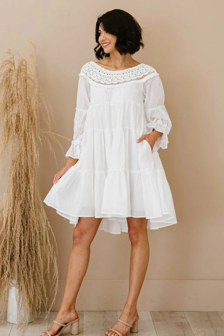 Boho meets sweeter-than-ever romantic with this crochet-trim dress. Featuring a full lining, tiers, three-quarter sleeves, and a perfect above-the-knee length, this dress will accompany you on all of the best days in your future. Plus, it has pockets and is 100% cotton.