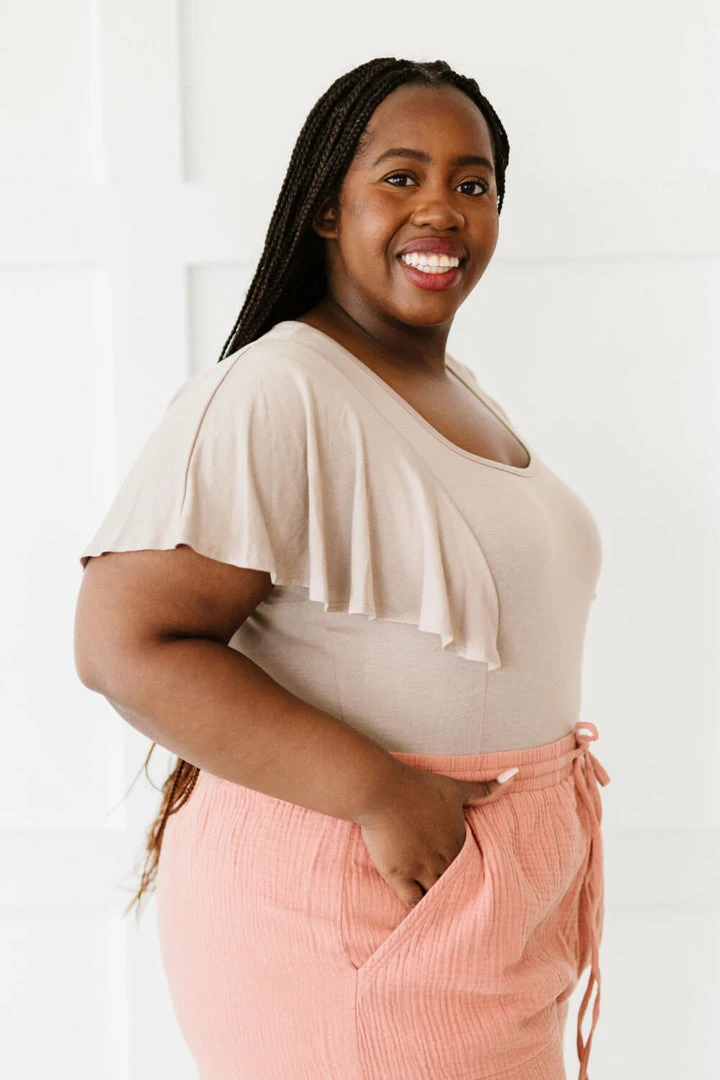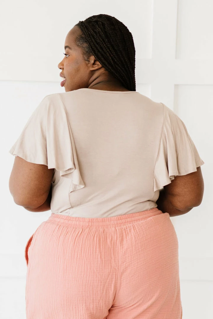 Graceful and romantic, this bodysuit is made of comfy and stretchy fabric with flowy flutter sleeves. Paired with an ethereal ruffled skirt, this bodysuit can become a piece fit for a goddess.