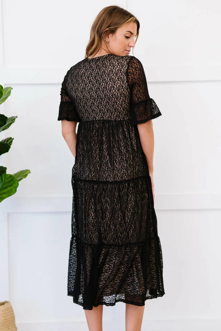 - Features: Midi, tiered, half-length flounce sleeves, lace