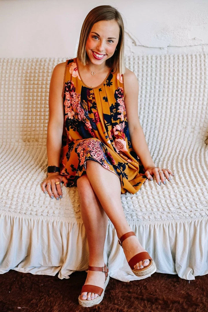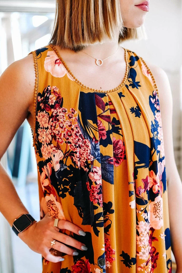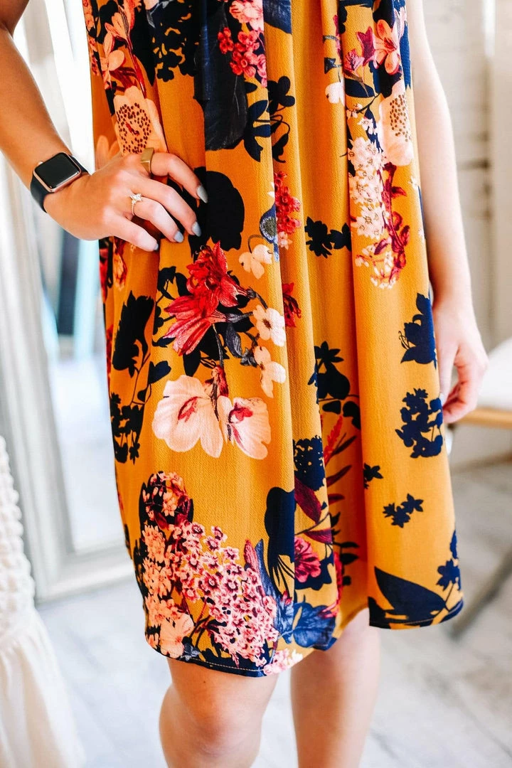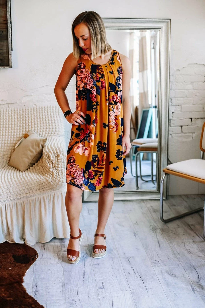 When I look at this dress I see a patio with music playing, a glass of wine and girlfriends. This dress screams summer girl getaway to me. OR a romantic day date with your significant other. This gorgeous sleeveless stretchy shift dress with a keyhole back is in one of our favorite colors, because this stunning mustard carries through to all seasons! With tights and boots and a jacket in the fall, or cute sandals and a sunhat in the summer, This number will never fail you, even over a baby bump!