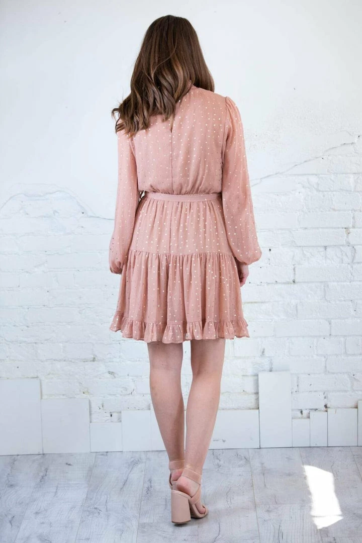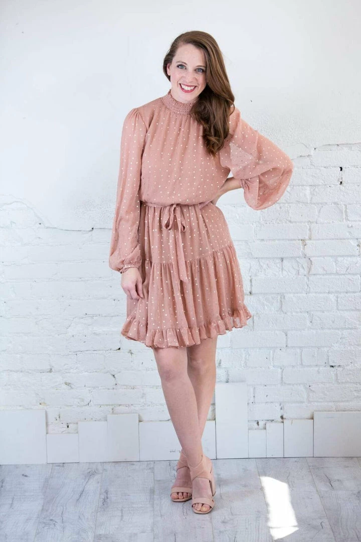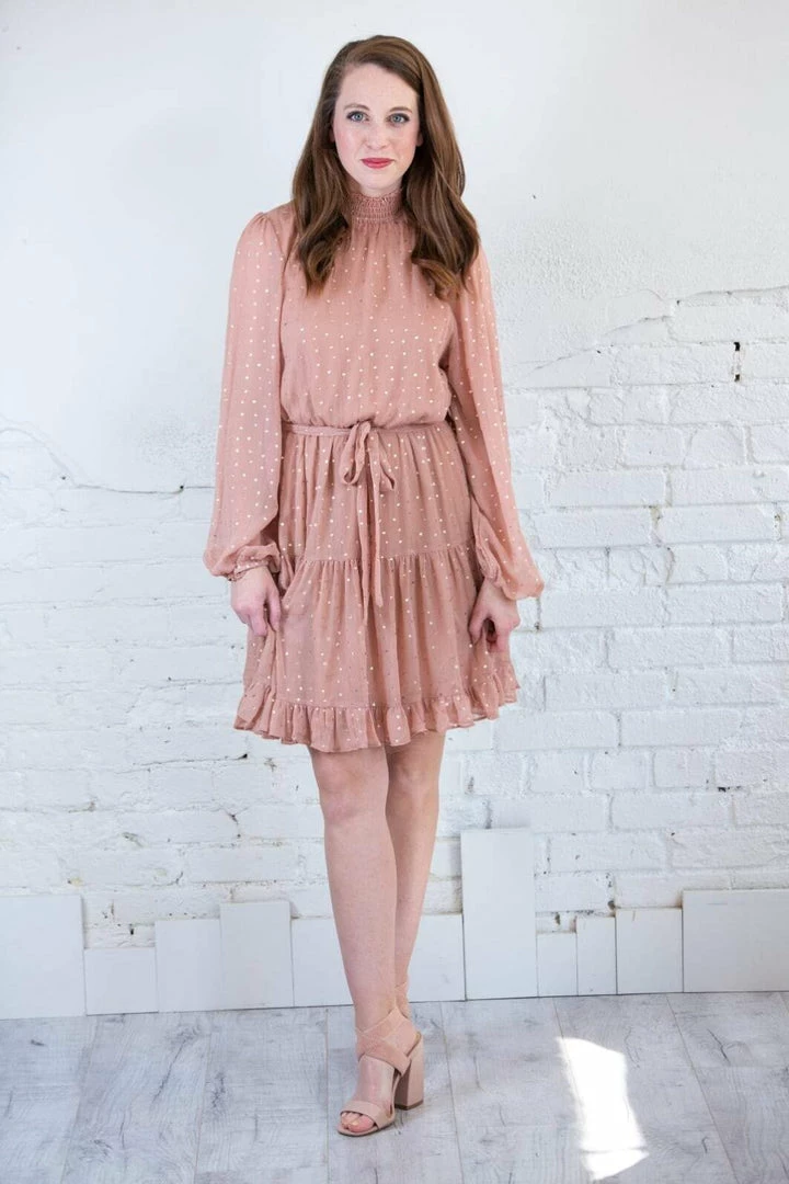 This gorgeous piece will carry you all through the season, but how perfect would she be for NYE!?!? This gorgeous dress features a mock turtleneck, with sheer chiffon elastic cuff sleeves and a tiered ruffle skirt. It’s fully lined with a functional waist tie as well in a gorgeous blush color with GOLD metallic dot details!!!!