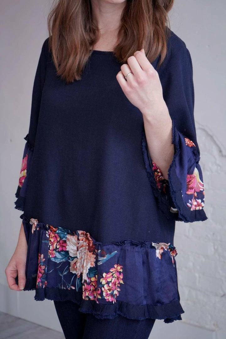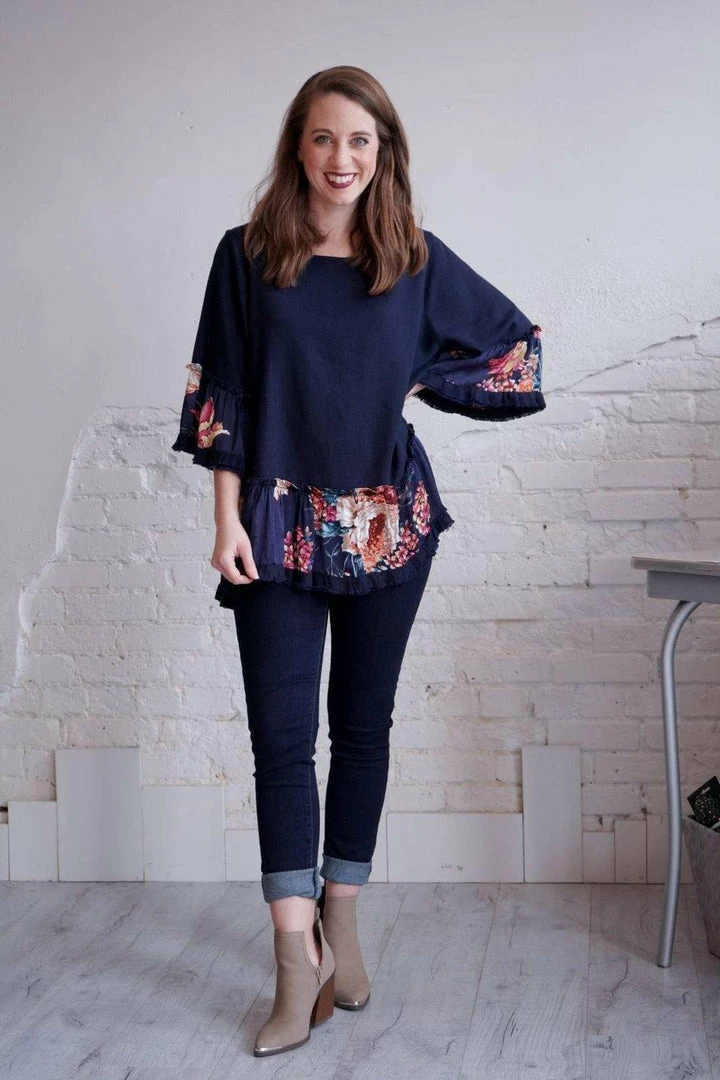 This stunning navy 3/4 sleeve top will help you slide into spring in lovely feminine style! Since it features a gorgeous bell sleeve with floral ruffles and a floral ruffle hem, in a super soft, luscious fabric, you will be able to pair it with denim, khaki, or white bottoms for any occasion! It would be so beautiful with our long Cross Necklace!