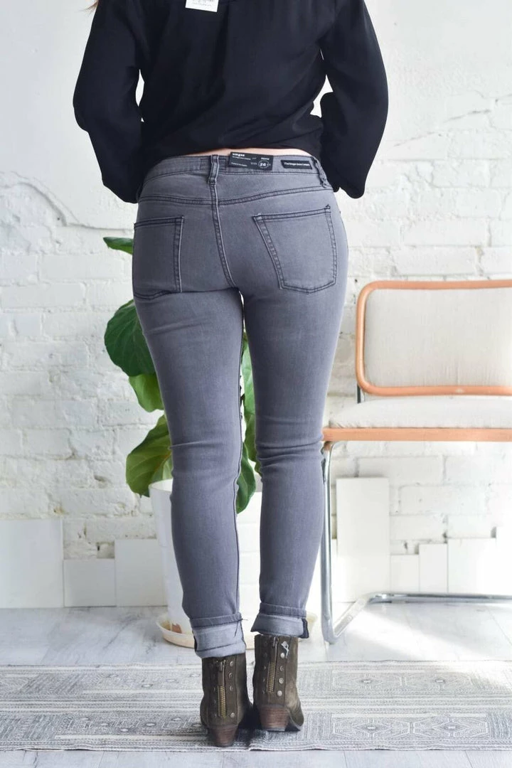 These mid rise, gray wash, whispered jeans make a total statement!!! So flattering with so much style! They feature a 5 pocket design with a raw hem, knee distressing and patchwork detail!