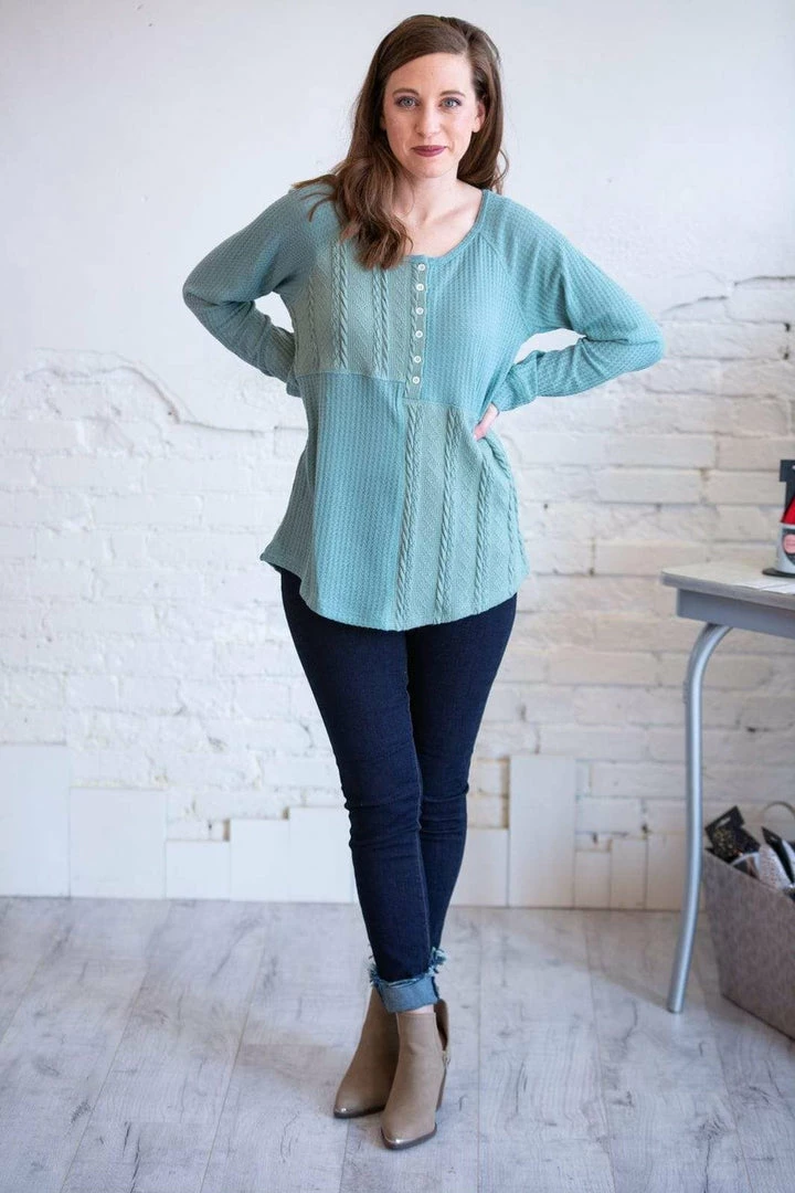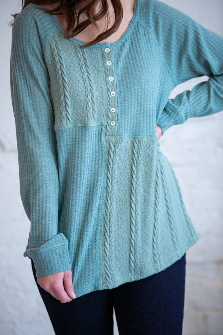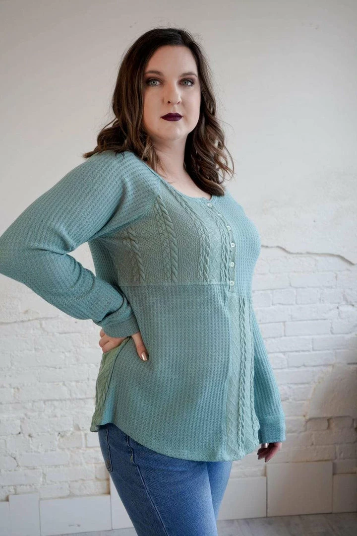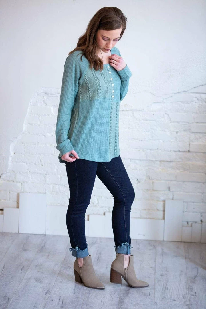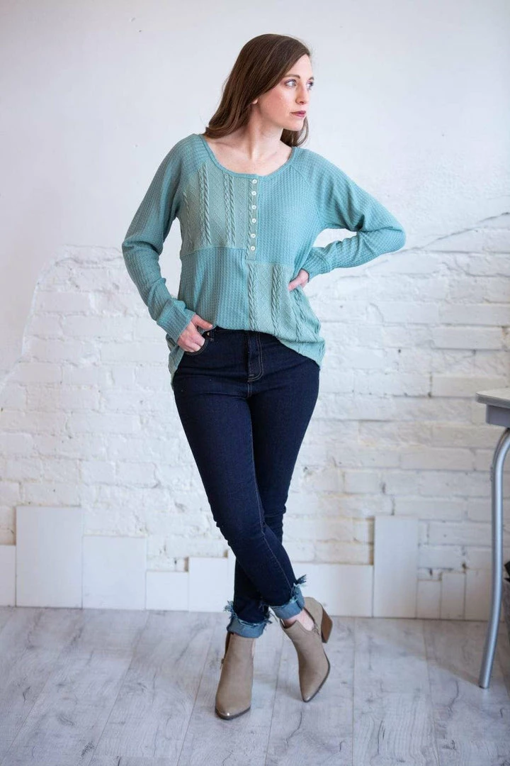 If the relaxed sweater trend isn’t for you, have we got an amazing top for you! This top is slightly fitted with a gorgeous flow on the body and amazing on all body types! With the patchwork textures and button detail it creates such gorgeous visual interest! Scoop neck, cable knit and a nice lovely long line cut, you will never put this away! Wear with denim, trousers or our tulip skirt!