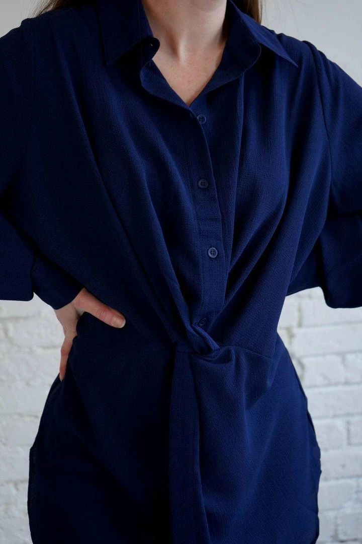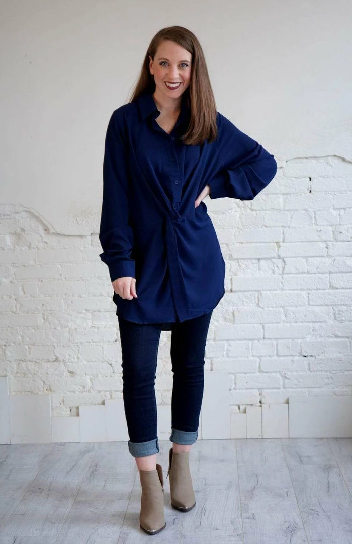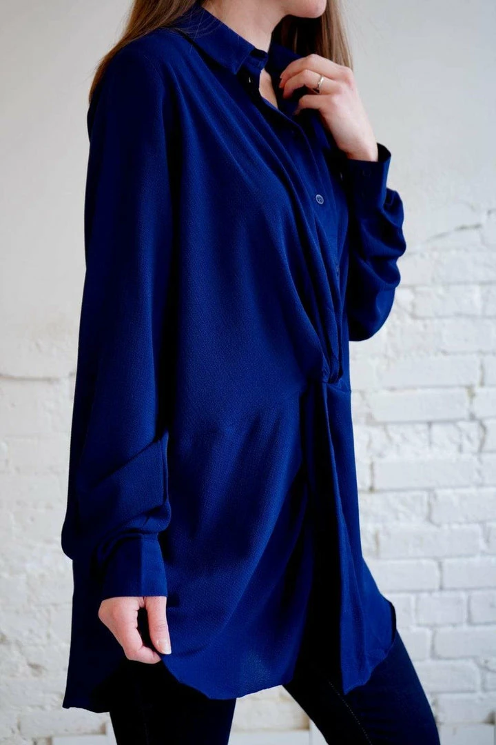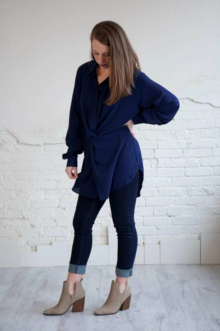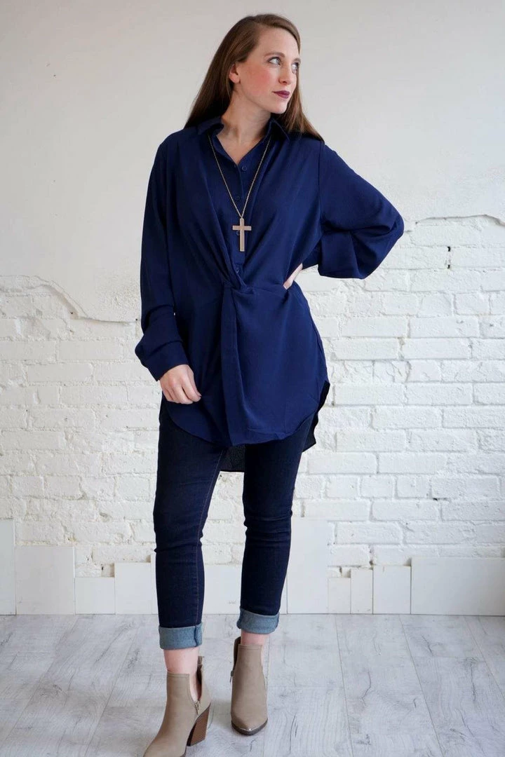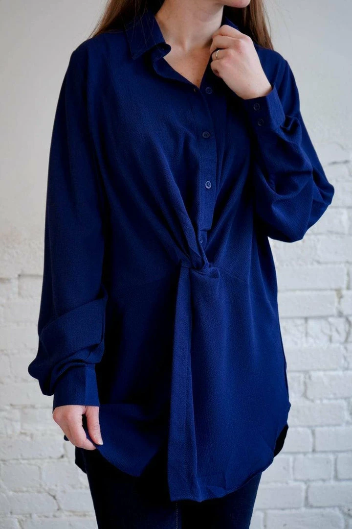 This is the most stunning, flattering collared blouse! In the perfect, rich navy, with a gathered knot detail at the natural waist. With long sleeves, button down style, and a scoop hem, you can easily take this too from the office to a lovely dinner party!