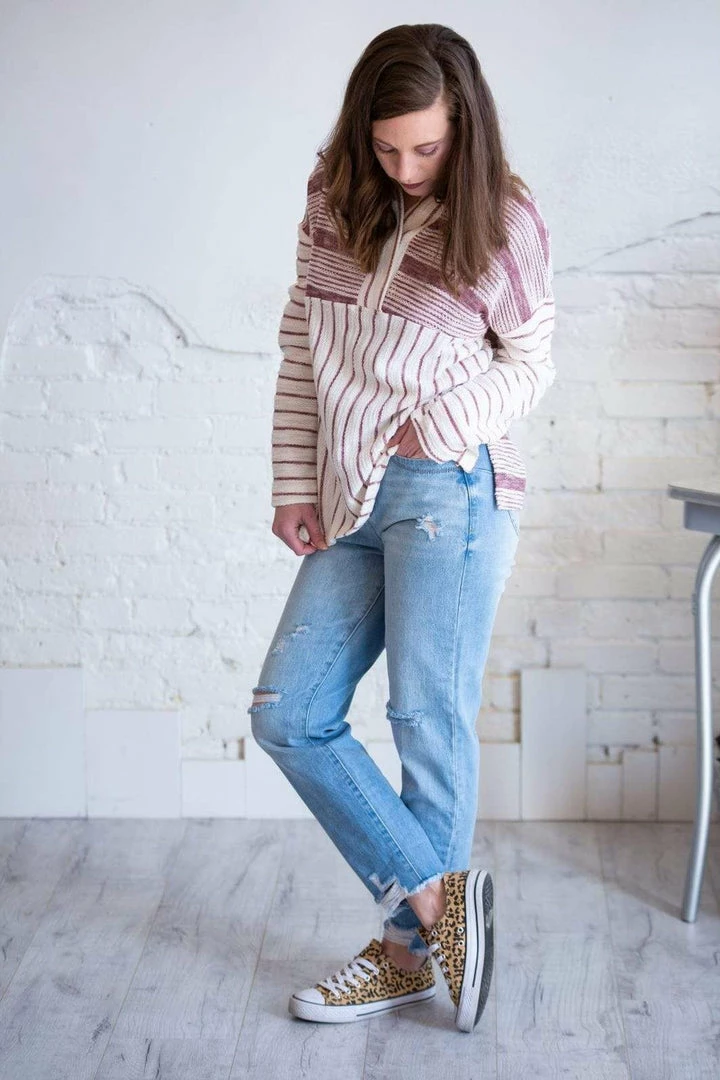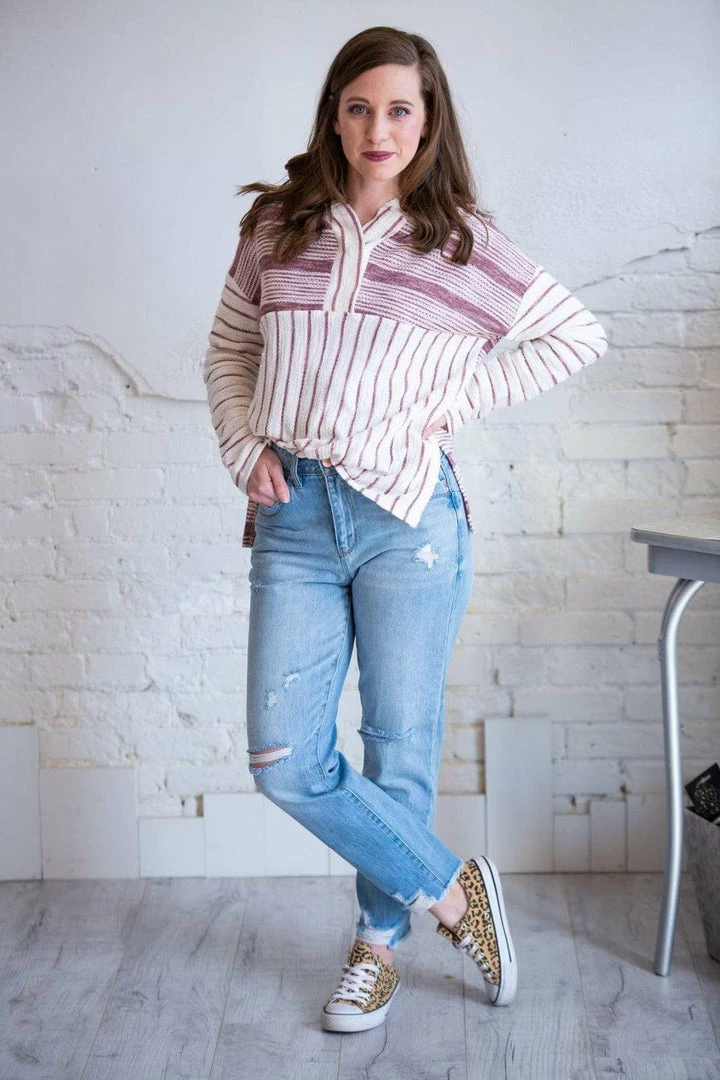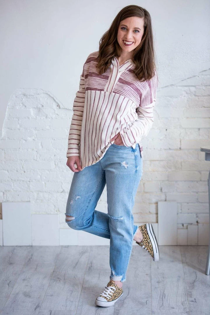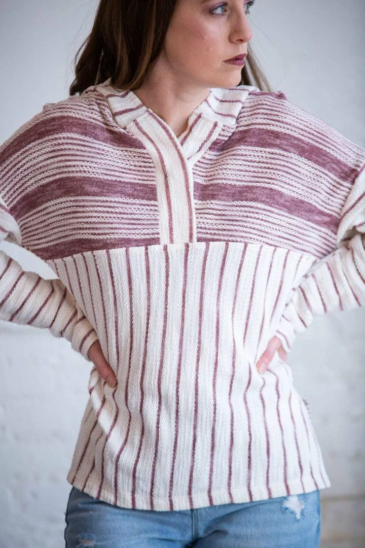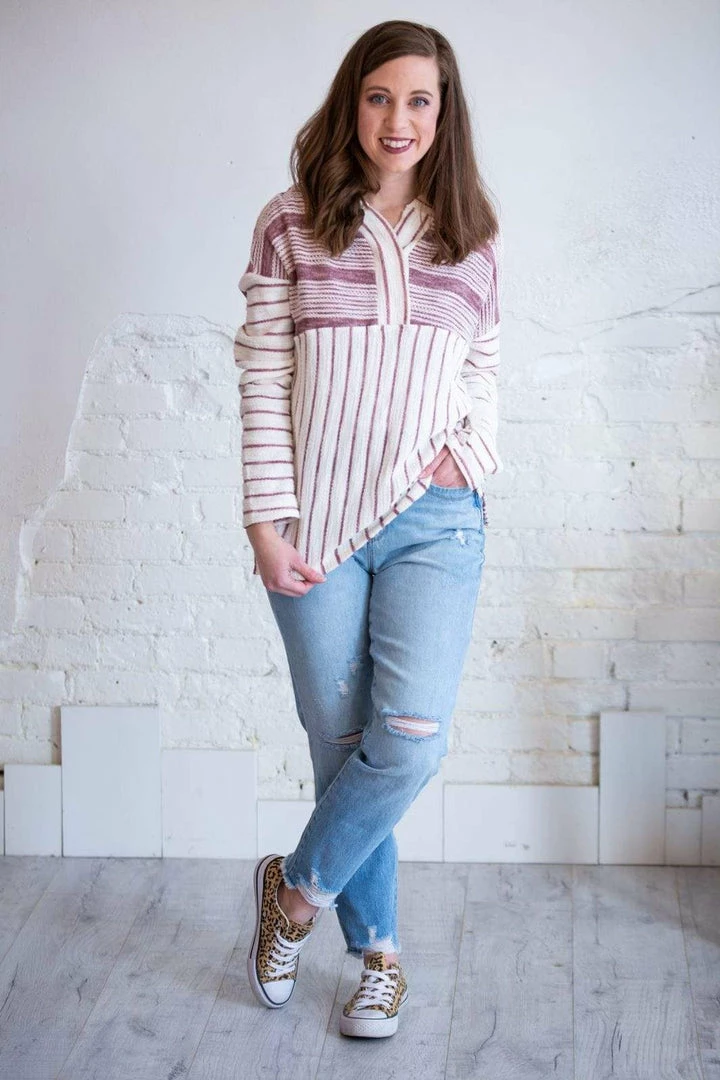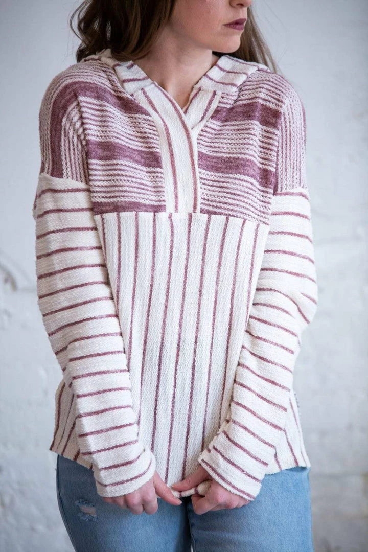 This Striped Long Sleeve Hooded Terry Cloth Top with a Button Neckline and Side Slits can be worn so many ways! The V neckline with the contrasting print makes it so interesting and easy to put together outfits! Pair with denim to do your daily errands or joggers to hang on the couch for movie night! So soft and super easy to care for!