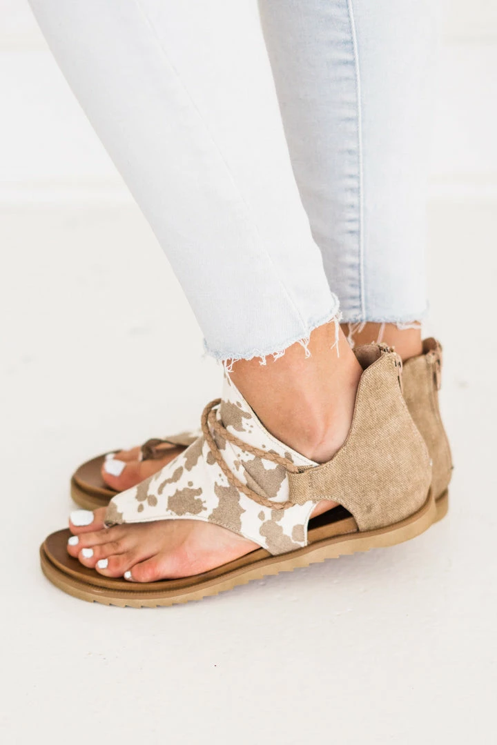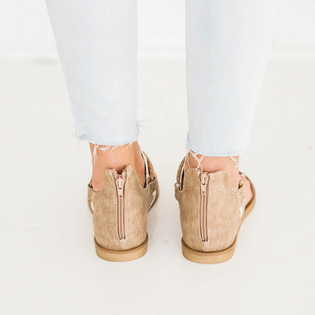 Adorable leopard canvas sandals with the COMFIEST foot bed! They feature a full sandal upper with a braided accent and zip back.